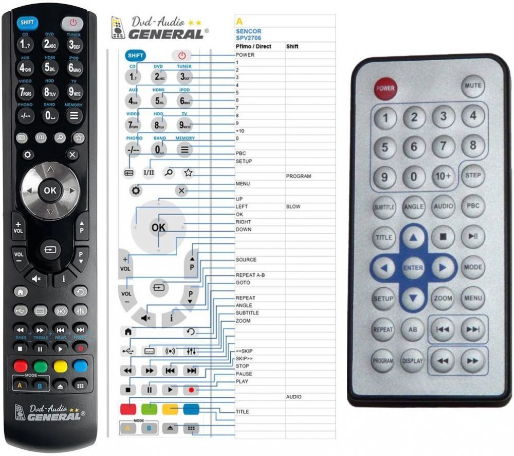Náhradní dálkový ovladač SENCOR SPV2909, SPV3010 - 100% náhrada 1:1 za originální dálkový ovladač. Dálkový ovladač byl vyvinut speciálně na míru pro tyto modely značky SENCOR:SPV 2909, SPV 3010, SPV-2909, SPV-3010, SPV2909, SPV3010. (Nemusí zde být uvedeny úplně všechny kompatibilní modely. Pokud si nejste jisti, sdělte nám svůj model (použijte online chat, e-mail, telefon), neprodleně zkontrolujeme a ověříme, zda je tento ovladač kompatibilní s Vaším přístrojem. Za poskytnutou informaci ručíme.) Ovladač je dodáván ve verzi značkového dálkového ovladače General DVD/AUDIO (zobrazen vlevo). Garantujeme Vám, že dostanete ovladač, který plně nahradí Váš původní originální ovladač a bude mít naprosto všechny funkce stejné.Není to univerzální ovladač, ale ovladač, který je naprogramován a přímo určen pro modely přístrojů uvedené výše. Není třeba žádné párování, žádné kódy. Obdržíte od nás ovladač, který je připraven k použití - jediné, co musíte udělat, je vložit baterie a ovladač hned funguje. Podívejte se na obrázek ovladače a ujistěte se, že jsou v tabulce všechny funkce jako na původním originálním ovladači. Jedná se o plnohodnotný náhradní dálkový ovladač (není to „univerzál“). Má naprosto všechny funkce přesně jako originální ovladač. Záruční lhůta na ovladač je 3 roky. Dodáván také jednoduchý návod s mapováním funkcí. DOPLŇKOVÁ FUNKCE: Tento dálkový ovladač je možno naprogramovat na 1 další přístroj. Budete moci jedním ovladačem ovládat oba přístroje (např. DVD+TV nebo SOUNDBAR+TV apod.). Pokud nám do komentáře v objednávce napíšete model dalšího přístroje, naprogramujeme Vám ovladač na oba. Za tuto doplňkovou službu bude naúčtován příplatek k ceně ovladače 50 Kč: více informací