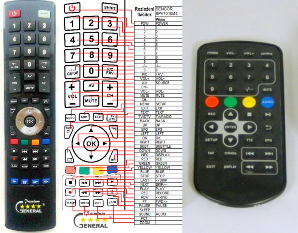 Náhradní dálkový ovladač SENCOR SPV7010M4 - 100procent náhrada 1:1 za originální dálkový ovladač. Dálkový ovladač je určen pro tyto modely SENCOR: SPV 7010M4, SPV-7010M4, SPV-7766TD, SPV7010M4, SPV7766TD. (Nemusí zde být uvedeny úplně všechny kompatibilní modely. Pokud si nejste jisti, sdělte nám svůj model (použijte online chat, e-mail, telefon), neprodleně zkontrolujeme a ověříme, zda je tento ovladač kompatibilní s Vaším přístrojem. Za poskytnutou informaci ručíme.) Ovladač je dodáván ve verzi značkového dálkového ovladače General Premium (zobrazen vlevo). Garantujeme Vám, že dostanete ovladač, který plně nahradí Váš původní originální ovladač a bude mít naprosto všechny funkce. Není to univerzální ovladač, ale ovladač, který je naprogramován a přímo určen pro modely přístrojů uvedené výše. Není třeba žádné párování, žádné kódy. Obdržíte od nás ovladač, který je připraven k použití - jediné, co musíte udělat, je vložit baterie a ovladač hned funguje. Podívejte se na obrázek ovladače a ujistěte se, že jsou v tabulce všechny funkce jako na původním originálním ovladači. Jedná se o plnohodnotný náhradní dálkový ovladač (není to „univerzál“). Má naprosto všechny funkce přesně jako originální ovladač. Záruční lhůta na ovladač je 2 roky. Dodáván také jednoduchý návod s mapováním funkcí. DOPLŇKOVÁ FUNKCE: Tento dálkový ovladač je možno naprogramovat na 1-4 zařízení (celkem tedy 4). Budete moci jedním ovladačem ovládat několik různých přístrojů jedním ovladačem. Pokud nám do komentáře v objednávce napíšete modely dalších přístrojů, naprogramujeme Vám ovladač na všechny. Za tuto doplňkovou službu bude naúčtován příplatek k ceně ovladače 50 Kč: více informací V případě, že v budoucnu vyměníte/obměníte Vaši domácí elektroniku, jsme schopni Vám tento ovladač přeprogramovat na naprosto jakékoliv nové/á zařízení. Ovladač General přežije Váš stávající přístroj!