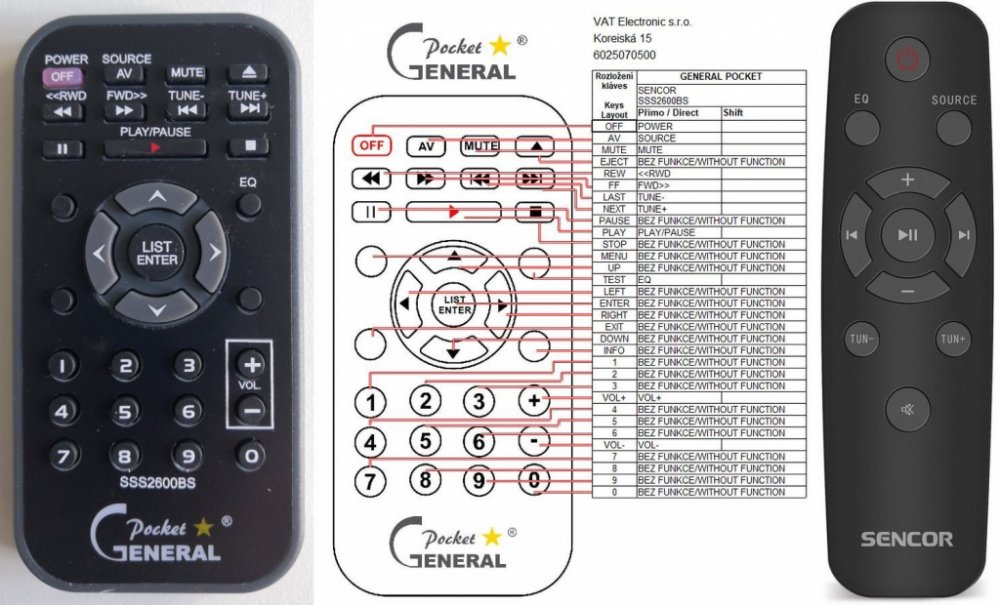 Dálkový ovladač SENCOR SSS2600BS duplikát 1:1 originálního dálkového ovladače. Dálkový ovladač byl vyvinut speciálně na míru pro tyto modely značky SENCOR:SSS2600BS. (Nemusí zde být uvedeny úplně všechny kompatibilní modely. Pokud si nejste jisti, sdělte nám svůj model (použijte online chat, e-mail, telefon), neprodleně zkontrolujeme a ověříme, zda je tento ovladač kompatibilní s Vaším přístrojem. Za poskytnutou informaci ručíme.) Dálkový ovladač General POCKET duplikát má naprosto všechny funkce a popisky tlačítek stejné jako originální dálkový ovladač. Není třeba nic nastavovat, žádné kódy, funguje ihned po vložení baterií se všemi výše uvedenými modely.Ovladač je dodáván ve verzi značkového dálkového ovladače General POCKET duplikát (zobrazen vlevo) Jedná se o ovladač vyrobený pro specifické zařízení – NENÍ to univerzální ovladač! Má naprosto všechny funkce jako originální dálkový ovladač. Má stejné popisky tlačítek, jako jste byli zvyklí z originálu. Popisky tlačítek jsou velmi odolné a nejdou seškrábat ani hrubou silou. 3 roky záruka.General POCKET duplikát byl navržen a vyroben přesně podle originálního dálkového ovladače tlačítko po tlačítku. Ovladač je vyvinut a testován v České republice a podléhá CE a ROHS standardům. SNADNÉ INTUITIVNÍ POUŽÍVÁNÍ: Na rozdíl od běžných náhradních ovladačů, General POCKET duplikát má 100% odpovídající popisky tlačítek jako na originálním ovladači. Srovnání: Jiné univerzální nebo programovatelné náhrady mají kvůli snížení nákladů názvy/popisky a rozložení tlačítek univerzální, popisky tlačítek často neodpovídají funkci tlačítka a vyžadují tedy návody k použití. To často vede k nejasnostem, co které tlačítko dělá a stálá potřeba manuálu je velmi obtěžující. S ovladačem General POCKET duplikát žádný návod nepotřebujete, tlačítko dělá přesně to, co symbolizuje jeho popisek.GARANTUJEME 100% FUNKČNOST: Narozdíl od jiných náhrad je každý dálkový ovladač General POCKET duplikát přímo v naší firmě navržen a testován na míru pro konkrétní z..