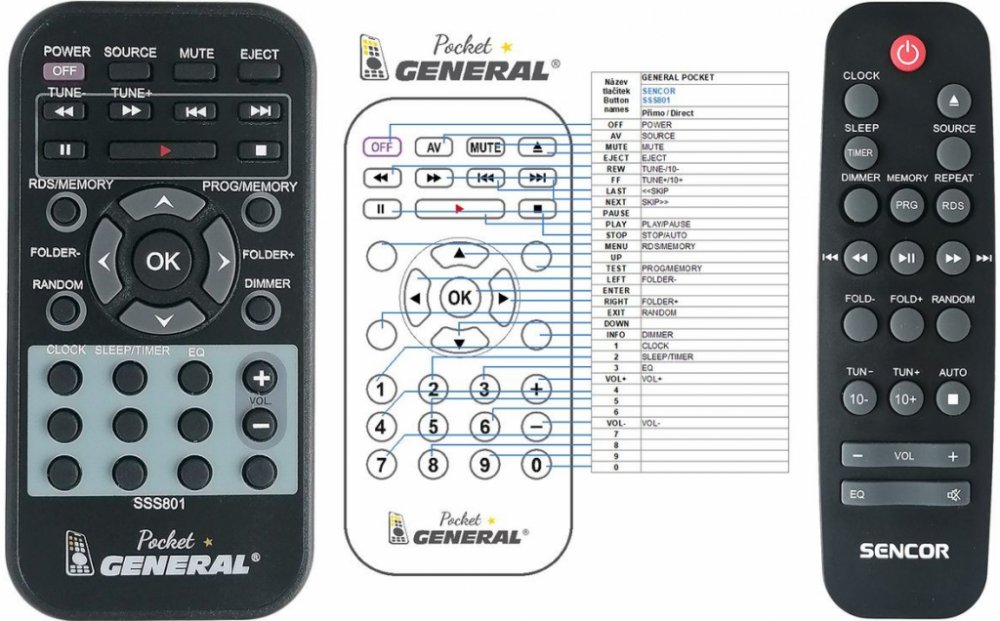 Dálkový ovladač SENCOR SSS801 duplikát 1:1 originálního dálkového ovladače. Dálkový ovladač je určen pro tyto modely SENCOR: SSS-801, SSS801. (Nemusí zde být uvedeny úplně všechny kompatibilní modely. Pokud si nejste jisti, sdělte nám svůj model (použijte online chat, e-mail, telefon), neprodleně zkontrolujeme a ověříme, zda je tento ovladač kompatibilní s Vaším přístrojem. Za poskytnutou informaci ručíme.) Dálkový ovladač General POCKET duplikát má naprosto všechny funkce a popisky tlačítek stejné jako originální dálkový ovladač. Není třeba nic nastavovat, žádné kódy, funguje ihned po vložení baterií se všemi výše uvedenými modely. Ovladač je dodáván ve verzi značkového dálkového ovladače General POCKET duplikát (zobrazen vlevo) Jedná se o ovladač vyrobený pro specifické zařízení – NENÍ to univerzální ovladač! Má naprosto všechny funkce jako originální dálkový ovladač. Má stejné popisky tlačítek, jako jste byli zvyklí z originálu. Popisky tlačítek jsou velmi odolné a nejdou seškrábat ani hrubou silou. 2 roky záruka. General POCKET duplikát byl navržen a vyroben přesně podle originálního dálkového ovladače tlačítko po tlačítku. Ovladač je vyvinut a testován v České republice a podléhá CE a ROHS standardům. SNADNÉ INTUITIVNÍ POUŽÍVÁNÍ: Na rozdíl od běžných náhradních ovladačů, General POCKET duplikát má 100procent odpovídající popisky tlačítek jako na originálním ovladači. Srovnání: Jiné univerzální nebo programovatelné náhrady mají kvůli snížení nákladů názvy/popisky a rozložení tlačítek univerzální, popisky tlačítek často neodpovídají funkci tlačítka a vyžadují tedy návody k použití. To často vede k nejasnostem, co které tlačítko dělá a stálá potřeba manuálu je velmi obtěžující. S ovladačem General POCKET duplikát žádný návod nepotřebujete, tlačítko dělá přesně to, co symbolizuje jeho popisek. GARANTUJEME 100procent FUNKČNOST: Narozdíl od jiných náhrad je každý dálkový ovladač General POCKET duplikát přímo v naší firmě navržen a testován na míru pro konkrétní zařízení tak, aby každé tlačítko odpovídalo funkci tlačítka originálního ovladače. Díky tomu můžeme zaručit 100procent funkčnost přesně jako originální ovladač. Samotné šasi bylo navrženo a vyvíjeno tak, aby bylo co nejodolnější a nejspolehlivější. Zároveň však byl kladen důraz na přívětivé rozložení tlačítek a popisky tlačítek jsou optimalizovány pro dobrou viditelnost. Materiály a součástky byly podrobeny důkladným testům, aby odolaly i tomu nejtvrdšímu zacházení a poskytovaly tak dlouhodobou životnost. Názvy tlačítek jsou na ovladači natištěny moderní technologií v naší firmě (naše vlastní know-how). Tisk je extrémně odolný a nelze jej setřít ani oškrábat. DUPLIKÁT originálního dálkového ovladače má naprosto stejné funkce a stejné názvy tlačítek jako Váš původní originální ovladač. Nemusíte nic nastavovat, po vložení baterií bude okamžitě fungovat, ovladač je již nakonfigurován tak, aby fungoval na modely uvedené výše. Nápisy na tlačítkách přesně odpovídají funkcím tlačítek, tiskneme je přesně podle originálního ovladače. Narozdíl od všech univerzálních a programovatelných náhrad, kde jsou názvy tlačítek univerzální a pro uživatele matoucí. Popisky jsou natištěny technicky vyspělou technologií v naší provozovně (naše know-how), jsou extrémně odolné, nejdou setřít ani seškrábat (např. nehtem). Opravdu jsme schopni vyrobit jakýkoliv dálkový ovladač! Splníme i požadavky na exotické ovladače, které nejsou (zatím) v naší nabídce. DUPLIKÁT = Nejlepší poměr cena/výkon. DOPORUČUJEME! DUPLIKÁT originálního dálkového ovladače má naprosto stejné funkce a stejné názvy tlačítek jako Váš původní originální ovladač. Nemusíte nic nastavovat, po vložení baterií bude okamžitě fungovat, ovladač je již nakonfigurován tak, aby fungoval na modely uvedené níže. Nápisy na tlacitkach přesně odpovídají funkcím tlačítek, tiskneme je přesně podle oriignálního ovladače. Narozdil od všech univerzalnich a programovatelnych náhrad, kde jsou názvy tlačítek univerzální a pro uživatele matoucí. Popisky jsou natištěny technicky vyspělou technologií v naší provozovně (naše know-how), jsou extrémně odolné, nejdou setřít ani seškrábat (např.nehtem). Opravdu jsme schopni vyrobit jakýkoliv dálkový ovladač! Splníme i požadavky na exotické ovladače, které nejsou (zatím :) v naší nabídce. DUPLIKÁT = Nejlepší poměr cena/výkon. DOPORUČUJEME!