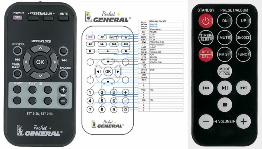 Dálkový ovladač SENCOR STT212U duplikát 1:1 originálního dálkového ovladače. Dálkový ovladač je určen pro tyto modely SENCOR: STT-212U, STT212U. (Nemusí zde být uvedeny úplně všechny kompatibilní modely. Pokud si nejste jisti, sdělte nám svůj model (použijte online chat, e-mail, telefon), neprodleně zkontrolujeme a ověříme, zda je tento ovladač kompatibilní s Vaším přístrojem. Za poskytnutou informaci ručíme.) Dálkový ovladač General POCKET duplikát má naprosto všechny funkce a popisky tlačítek stejné jako originální dálkový ovladač. Není třeba nic nastavovat, žádné kódy, funguje ihned po vložení baterií se všemi výše uvedenými modely. Ovladač je dodáván ve verzi značkového dálkového ovladače General POCKET duplikát (zobrazen vlevo) Jedná se o ovladač vyrobený pro specifické zařízení – NENÍ to univerzální ovladač! Má naprosto všechny funkce jako originální dálkový ovladač. Má stejné popisky tlačítek, jako jste byli zvyklí z originálu. Popisky tlačítek jsou velmi odolné a nejdou seškrábat ani hrubou silou. 2 roky záruka. General POCKET duplikát byl navržen a vyroben přesně podle originálního dálkového ovladače tlačítko po tlačítku. Ovladač je vyvinut a testován v České republice a podléhá CE a ROHS standardům. SNADNÉ INTUITIVNÍ POUŽÍVÁNÍ: Na rozdíl od běžných náhradních ovladačů, General POCKET duplikát má 100procent odpovídající popisky tlačítek jako na originálním ovladači. Srovnání: Jiné univerzální nebo programovatelné náhrady mají kvůli snížení nákladů názvy/popisky a rozložení tlačítek univerzální, popisky tlačítek často neodpovídají funkci tlačítka a vyžadují tedy návody k použití. To často vede k nejasnostem, co které tlačítko dělá a stálá potřeba manuálu je velmi obtěžující. S ovladačem General POCKET duplikát žádný návod nepotřebujete, tlačítko dělá přesně to, co symbolizuje jeho popisek. GARANTUJEME 100procent FUNKČNOST: Narozdíl od jiných náhrad je každý dálkový ovladač General POCKET duplikát přímo v naší firmě navržen a testován na míru pro konkrétní zařízení tak, aby každé tlačítko odpovídalo funkci tlačítka originálního ovladače. Díky tomu můžeme zaručit 100procent funkčnost přesně jako originální ovladač. Samotné šasi bylo navrženo a vyvíjeno tak, aby bylo co nejodolnější a nejspolehlivější. Zároveň však byl kladen důraz na přívětivé rozložení tlačítek a popisky tlačítek jsou optimalizovány pro dobrou viditelnost. Materiály a součástky byly podrobeny důkladným testům, aby odolaly i tomu nejtvrdšímu zacházení a poskytovaly tak dlouhodobou životnost. Názvy tlačítek jsou na ovladači natištěny moderní technologií v naší firmě (naše vlastní know-how). Tisk je extrémně odolný a nelze jej setřít ani oškrábat. DUPLIKÁT originálního dálkového ovladače má naprosto stejné funkce a stejné názvy tlačítek jako Váš původní originální ovladač. Nemusíte nic nastavovat, po vložení baterií bude okamžitě fungovat, ovladač je již nakonfigurován tak, aby fungoval na modely uvedené výše. Nápisy na tlačítkách přesně odpovídají funkcím tlačítek, tiskneme je přesně podle originálního ovladače. Narozdíl od všech univerzálních a programovatelných náhrad, kde jsou názvy tlačítek univerzální a pro uživatele matoucí. Popisky jsou natištěny technicky vyspělou technologií v naší provozovně (naše know-how), jsou extrémně odolné, nejdou setřít ani seškrábat (např. nehtem). Opravdu jsme schopni vyrobit jakýkoliv dálkový ovladač! Splníme i požadavky na exotické ovladače, které nejsou (zatím) v naší nabídce. DUPLIKÁT = Nejlepší poměr cena/výkon. DOPORUČUJEME! DUPLIKÁT originálního dálkového ovladače má naprosto stejné funkce a stejné názvy tlačítek jako Váš původní originální ovladač. Nemusíte nic nastavovat, po vložení baterií bude okamžitě fungovat, ovladač je již nakonfigurován tak, aby fungoval na modely uvedené níže. Nápisy na tlacitkach přesně odpovídají funkcím tlačítek, tiskneme je přesně podle oriignálního ovladače. Narozdil od všech univerzalnich a programovatelnych náhrad, kde jsou názvy tlačítek univerzální a pro uživatele matoucí. Popisky jsou natištěny technicky vyspělou technologií v naší provozovně (naše know-how), jsou extrémně odolné, nejdou setřít ani seškrábat (např.nehtem). Opravdu jsme schopni vyrobit jakýkoliv dálkový ovladač! Splníme i požadavky na exotické ovladače, které nejsou (zatím :) v naší nabídce. DUPLIKÁT = Nejlepší poměr cena/výkon. DOPORUČUJEME!