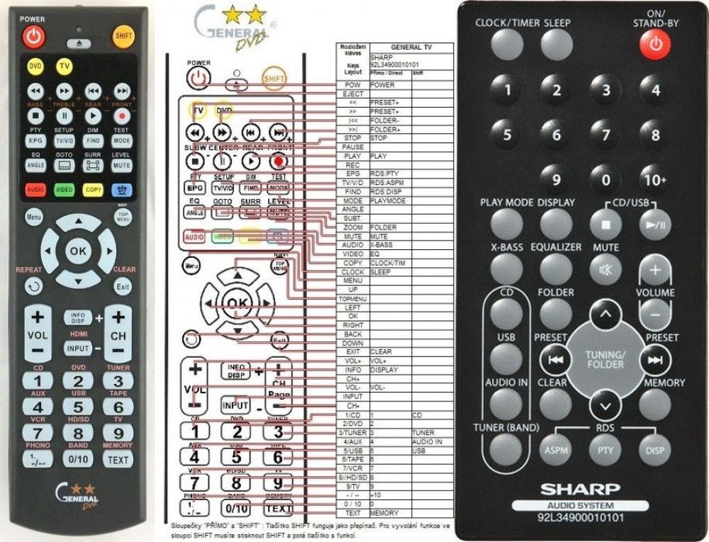 Náhradní dálkový ovladač SHARP 92L34900010101 - 100% náhrada 1:1 za originální dálkový ovladač. Dálkový ovladač byl vyvinut speciálně na míru pro tyto modely značky SHARP:XL-E1H, XLE1H. (Nemusí zde být uvedeny úplně všechny kompatibilní modely. Pokud si nejste jisti, sdělte nám svůj model (použijte online chat, e-mail, telefon), neprodleně zkontrolujeme a ověříme, zda je tento ovladač kompatibilní s Vaším přístrojem. Za poskytnutou informaci ručíme.) Ovladač je dodáván ve verzi značkového dálkového ovladače General DVD/AUDIO (zobrazen vlevo). Garantujeme Vám, že dostanete ovladač, který plně nahradí Váš původní originální ovladač a bude mít naprosto všechny funkce stejné.Není to univerzální ovladač, ale ovladač, který je naprogramován a přímo určen pro modely přístrojů uvedené výše. Není třeba žádné párování, žádné kódy. Obdržíte od nás ovladač, který je připraven k použití - jediné, co musíte udělat, je vložit baterie a ovladač hned funguje. Podívejte se na obrázek ovladače a ujistěte se, že jsou v tabulce všechny funkce jako na původním originálním ovladači. Jedná se o plnohodnotný náhradní dálkový ovladač (není to „univerzál“). Má naprosto všechny funkce přesně jako originální ovladač. Záruční lhůta na ovladač je 3 roky. Dodáván také jednoduchý návod s mapováním funkcí. DOPLŇKOVÁ FUNKCE: Tento dálkový ovladač je možno naprogramovat na 1 další přístroj. Budete moci jedním ovladačem ovládat oba přístroje (např. DVD+TV nebo SOUNDBAR+TV apod.). Pokud nám do komentáře v objednávce napíšete model dalšího přístroje, naprogramujeme Vám ovladač na oba. Za tuto doplňkovou službu bude naúčtován příplatek k ceně ovladače 50 Kč: více informací