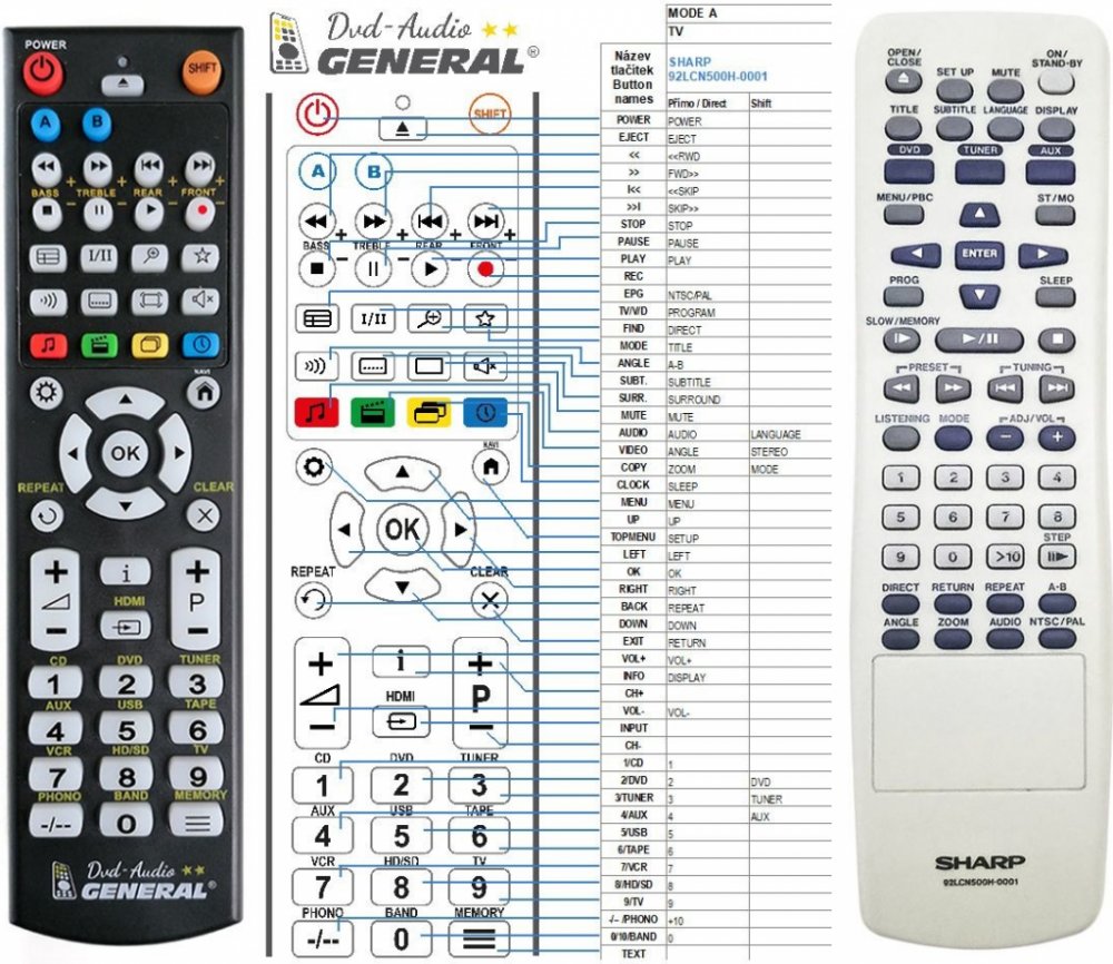 Náhradní dálkový ovladač SHARP 92LCN500H-0001 (92LCN500H0001) - 100% náhrada 1:1 za originální dálkový ovladač. Dálkový ovladač byl vyvinut speciálně na míru pro tyto modely značky SHARP:DVD-HT-CN 400DV, HT-CN400DVE, HT-CN400DVH, HT-CN410DVH, HT-CN500DVE, HT-CN500DVH. (Nemusí zde být uvedeny úplně všechny kompatibilní modely. Pokud si nejste jisti, sdělte nám svůj model (použijte online chat, e-mail, telefon), neprodleně zkontrolujeme a ověříme, zda je tento ovladač kompatibilní s Vaším přístrojem. Za poskytnutou informaci ručíme.) Ovladač je dodáván ve verzi značkového dálkového ovladače General DVD/AUDIO (zobrazen vlevo). Garantujeme Vám, že dostanete ovladač, který plně nahradí Váš původní originální ovladač a bude mít naprosto všechny funkce stejné.Není to univerzální ovladač, ale ovladač, který je naprogramován a přímo určen pro modely přístrojů uvedené výše. Není třeba žádné párování, žádné kódy. Obdržíte od nás ovladač, který je připraven k použití - jediné, co musíte udělat, je vložit baterie a ovladač hned funguje. Podívejte se na obrázek ovladače a ujistěte se, že jsou v tabulce všechny funkce jako na původním originálním ovladači. Jedná se o plnohodnotný náhradní dálkový ovladač (není to „univerzál“). Má naprosto všechny funkce přesně jako originální ovladač. Záruční lhůta na ovladač je 3 roky. Dodáván také jednoduchý návod s mapováním funkcí. DOPLŇKOVÁ FUNKCE: Tento dálkový ovladač je možno naprogramovat na 1 další přístroj. Budete moci jedním ovladačem ovládat oba přístroje (např. DVD+TV nebo SOUNDBAR+TV apod.). Pokud nám do komentáře v objednávce napíšete model dalšího přístroje, naprogramujeme Vám ovladač na oba. Za tuto doplňkovou službu bude naúčtován příplatek k ceně ovladače 50 Kč: více informací
