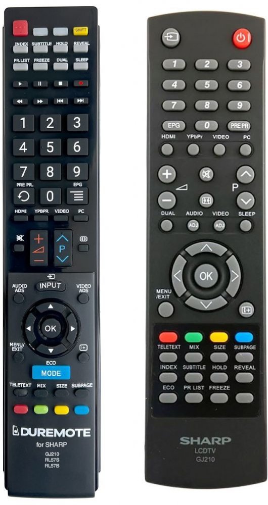 Dálkový ovladač SHARP GJ210, 9JR9800000003 duplikát 1:1 originálního dálkového ovladače. Dálkový ovladač byl vyvinut speciálně na míru pro tyto modely značky SHARP:LC-19S7E, LC-19SH7E-BK, LC-26S7E, LC-26SB25E, LC-26SB25S, LC-26SH7E-BK, LC-32S7E, LC-32SB25E, LC-32SH7E, LC-32SH7E-BK, LC-42SB55E, LC-42SH7E-BK, LC19SH7EBK, LC26SH7EBK, LC32SH7EBK. (Nemusí zde být uvedeny úplně všechny kompatibilní modely. Pokud si nejste jisti, sdělte nám svůj model (použijte online chat, e-mail, telefon), neprodleně zkontrolujeme a ověříme, zda je tento ovladač kompatibilní s Vaším přístrojem. Za poskytnutou informaci ručíme.) Dálkový ovladač General Duremote má naprosto všechny funkce a popisky tlačítek stejné jako originální dálkový ovladač. Není třeba nic nastavovat, žádné kódy, funguje ihned po vložení baterií se všemi výše uvedenými modely.Ovladač je dodáván ve verzi značkového dálkového ovladače General Duremote (zobrazen vlevo) Jedná se o ovladač vyrobený pro specifické zařízení – NENÍ to univerzální ovladač! Má naprosto všechny funkce jako originální dálkový ovladač. Má stejné popisky tlačítek, jako jste byli zvyklí z originálu. Popisky tlačítek jsou velmi odolné a nejdou seškrábat ani hrubou silou. 3 roky záruka.General Duremote byl navržen a vyroben přesně podle originálního dálkového ovladače tlačítko po tlačítku. Ovladač je vyvinut a testován v České republice a podléhá CE a ROHS standardům. SNADNÉ INTUITIVNÍ POUŽÍVÁNÍ: Na rozdíl od běžných náhradních ovladačů, General Duremote má 100% odpovídající popisky tlačítek jako na originálním ovladači. Srovnání: Jiné univerzální nebo programovatelné náhrady mají kvůli snížení nákladů názvy/popisky a rozložení tlačítek univerzální, popisky tlačítek často neodpovídají funkci tlačítka a vyžadují tedy návody k použití. To často vede k nejasnostem, co které tlačítko dělá a stálá potřeba manuálu je velmi obtěžující. S ovladačem General Duremote žádný návod nepotřebujete, tlačítko dělá přesně to, co symbolizuje jeho popisek.GARANTUJEME 100% FUN..