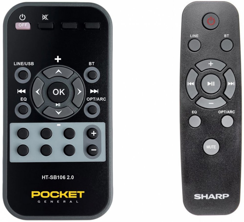 Dálkový ovladač SHARP HT-SB106 2.0 (HTSB106 2.0) duplikát 1:1 originálního dálkového ovladače. Dálkový ovladač General POCKET duplikát má naprosto všechny funkce a popisky tlačítek stejné jako originální dálkový ovladač. Není třeba nic nastavovat, žádné kódy, funguje ihned po vložení baterií se všemi výše uvedenými modely.Ovladač je dodáván ve verzi značkového dálkového ovladače General POCKET dup