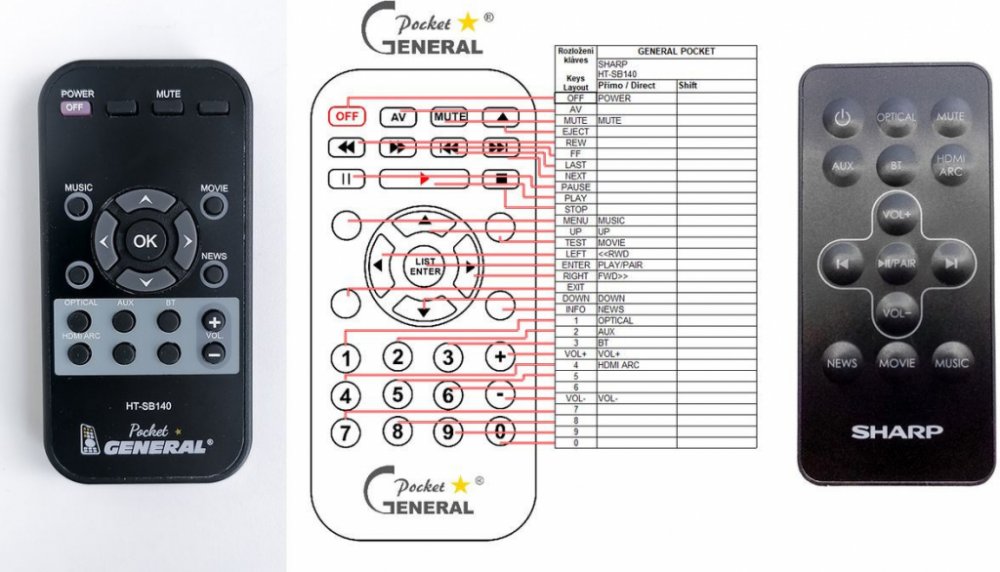 Dálkový ovladač SHARP HT-SB140 (HTSB140) duplikát 1:1 originálního dálkového ovladače. Dálkový ovladač je určen pro tyto modely SHARP: HT-SB110, HT-SB115, HT-SB140, HT-SBW160, HTSB110, HTSB115, HTSB140, HTSBW160. (Nemusí zde být uvedeny úplně všechny kompatibilní modely. Pokud si nejste jisti, sdělte nám svůj model (použijte online chat, e-mail, telefon), neprodleně zkontrolujeme a ověříme, zda je tento ovladač kompatibilní s Vaším přístrojem. Za poskytnutou informaci ručíme.) Dálkový ovladač General POCKET duplikát má naprosto všechny funkce a popisky tlačítek stejné jako originální dálkový ovladač. Není třeba nic nastavovat, žádné kódy, funguje ihned po vložení baterií se všemi výše uvedenými modely. Ovladač je dodáván ve verzi značkového dálkového ovladače General POCKET duplikát (zobrazen vlevo) Jedná se o ovladač vyrobený pro specifické zařízení – NENÍ to univerzální ovladač! Má naprosto všechny funkce jako originální dálkový ovladač. Má stejné popisky tlačítek, jako jste byli zvyklí z originálu. Popisky tlačítek jsou velmi odolné a nejdou seškrábat ani hrubou silou. 2 roky záruka. General POCKET duplikát byl navržen a vyroben přesně podle originálního dálkového ovladače tlačítko po tlačítku. Ovladač je vyvinut a testován v České republice a podléhá CE a ROHS standardům. SNADNÉ INTUITIVNÍ POUŽÍVÁNÍ: Na rozdíl od běžných náhradních ovladačů, General POCKET duplikát má 100procent odpovídající popisky tlačítek jako na originálním ovladači. Srovnání: Jiné univerzální nebo programovatelné náhrady mají kvůli snížení nákladů názvy/popisky a rozložení tlačítek univerzální, popisky tlačítek často neodpovídají funkci tlačítka a vyžadují tedy návody k použití. To často vede k nejasnostem, co které tlačítko dělá a stálá potřeba manuálu je velmi obtěžující. S ovladačem General POCKET duplikát žádný návod nepotřebujete, tlačítko dělá přesně to, co symbolizuje jeho popisek. GARANTUJEME 100procent FUNKČNOST: Narozdíl od jiných náhrad je každý dálkový ovladač General POCKET duplikát přímo v naší firmě navržen a testován na míru pro konkrétní zařízení tak, aby každé tlačítko odpovídalo funkci tlačítka originálního ovladače. Díky tomu můžeme zaručit 100procent funkčnost přesně jako originální ovladač. Samotné šasi bylo navrženo a vyvíjeno tak, aby bylo co nejodolnější a nejspolehlivější. Zároveň však byl kladen důraz na přívětivé rozložení tlačítek a popisky tlačítek jsou optimalizovány pro dobrou viditelnost. Materiály a součástky byly podrobeny důkladným testům, aby odolaly i tomu nejtvrdšímu zacházení a poskytovaly tak dlouhodobou životnost. Názvy tlačítek jsou na ovladači natištěny moderní technologií v naší firmě (naše vlastní know-how). Tisk je extrémně odolný a nelze jej setřít ani oškrábat. DUPLIKÁT originálního dálkového ovladače má naprosto stejné funkce a stejné názvy tlačítek jako Váš původní originální ovladač. Nemusíte nic nastavovat, po vložení baterií bude okamžitě fungovat, ovladač je již nakonfigurován tak, aby fungoval na modely uvedené výše. Nápisy na tlačítkách přesně odpovídají funkcím tlačítek, tiskneme je přesně podle originálního ovladače. Narozdíl od všech univerzálních a programovatelných náhrad, kde jsou názvy tlačítek univerzální a pro uživatele matoucí. Popisky jsou natištěny technicky vyspělou technologií v naší provozovně (naše know-how), jsou extrémně odolné, nejdou setřít ani seškrábat (např. nehtem). Opravdu jsme schopni vyrobit jakýkoliv dálkový ovladač! Splníme i požadavky na exotické ovladače, které nejsou (zatím) v naší nabídce. DUPLIKÁT = Nejlepší poměr cena/výkon. DOPORUČUJEME! DUPLIKÁT originálního dálkového ovladače má naprosto stejné funkce a stejné názvy tlačítek jako Váš původní originální ovladač. Nemusíte nic nastavovat, po vložení baterií bude okamžitě fungovat, ovladač je již nakonfigurován tak, aby fungoval na modely uvedené níže. Nápisy na tlacitkach přesně odpovídají funkcím tlačítek, tiskneme je přesně podle oriignálního ovladače. Narozdil od všech univerzalnich a programovatelnych náhrad, kde jsou názvy tlačítek univerzální a pro uživatele matoucí. Popisky jsou natištěny technicky vyspělou technologií v naší provozovně (naše know-how), jsou extrémně odolné, nejdou setřít ani seškrábat (např.nehtem). Opravdu jsme schopni vyrobit jakýkoliv dálkový ovladač! Splníme i požadavky na exotické ovladače, které nejsou (zatím :) v naší nabídce. DUPLIKÁT = Nejlepší poměr cena/výkon. DOPORUČUJEME!