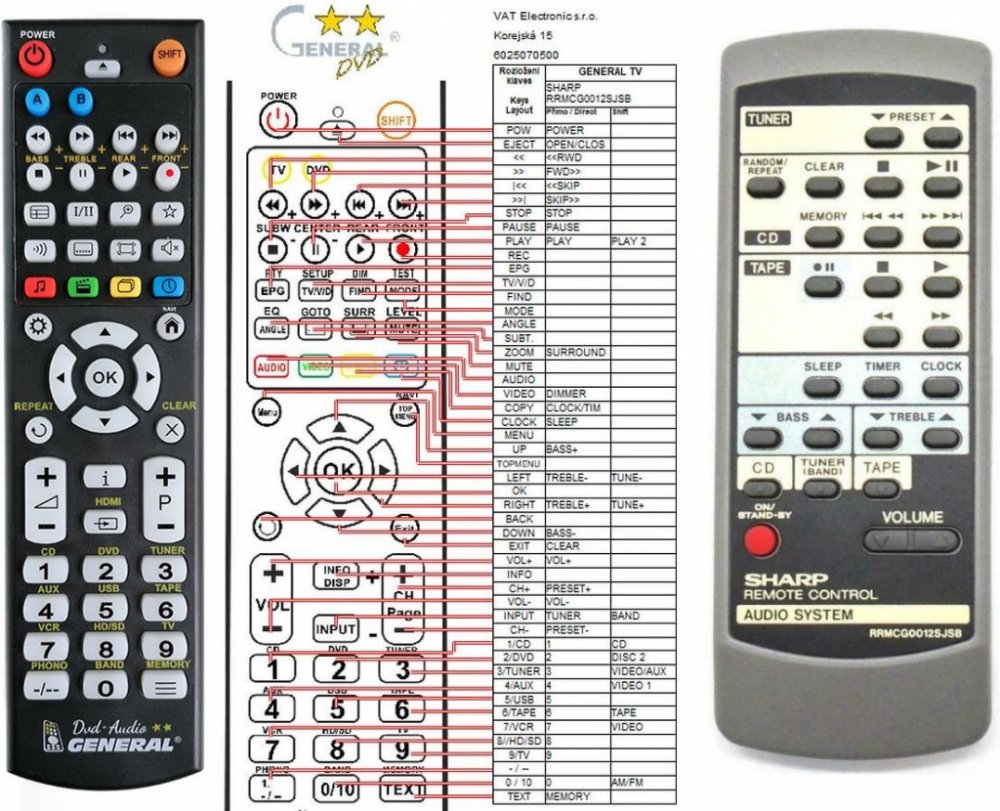 Náhradní dálkový ovladač SHARP RRMCG0012SJSB - 100% náhrada 1:1 za originální dálkový ovladač. Dálkový ovladač byl vyvinut speciálně na míru pro tyto modely značky SHARP:XL-30H, XL30H. (Nemusí zde být uvedeny úplně všechny kompatibilní modely. Pokud si nejste jisti, sdělte nám svůj model (použijte online chat, e-mail, telefon), neprodleně zkontrolujeme a ověříme, zda je tento ovladač kompatibilní s Vaším přístrojem. Za poskytnutou informaci ručíme.) Ovladač je dodáván ve verzi značkového dálkového ovladače General DVD/AUDIO (zobrazen vlevo). Garantujeme Vám, že dostanete ovladač, který plně nahradí Váš původní originální ovladač a bude mít naprosto všechny funkce stejné.Není to univerzální ovladač, ale ovladač, který je naprogramován a přímo určen pro modely přístrojů uvedené výše. Není třeba žádné párování, žádné kódy. Obdržíte od nás ovladač, který je připraven k použití - jediné, co musíte udělat, je vložit baterie a ovladač hned funguje. Podívejte se na obrázek ovladače a ujistěte se, že jsou v tabulce všechny funkce jako na původním originálním ovladači. Jedná se o plnohodnotný náhradní dálkový ovladač (není to „univerzál“). Má naprosto všechny funkce přesně jako originální ovladač. Záruční lhůta na ovladač je 3 roky. Dodáván také jednoduchý návod s mapováním funkcí. DOPLŇKOVÁ FUNKCE: Tento dálkový ovladač je možno naprogramovat na 1 další přístroj. Budete moci jedním ovladačem ovládat oba přístroje (např. DVD+TV nebo SOUNDBAR+TV apod.). Pokud nám do komentáře v objednávce napíšete model dalšího přístroje, naprogramujeme Vám ovladač na oba. Za tuto doplňkovou službu bude naúčtován příplatek k ceně ovladače 50 Kč: více informací