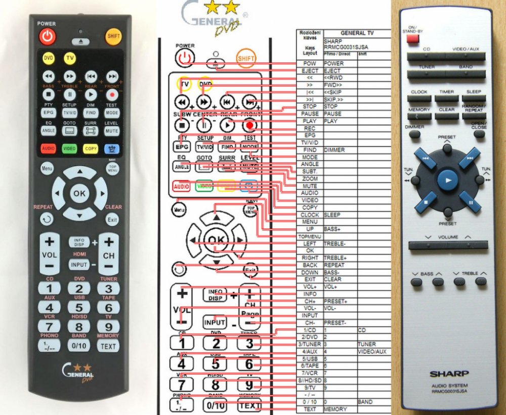Náhradní dálkový ovladač SHARP RRMCG0031SJSA - 100% náhrada 1:1 za originální dálkový ovladač. Dálkový ovladač byl vyvinut speciálně na míru pro tyto modely značky SHARP:XL-1000H, XL-1100H, XL1000H, XL1100H. (Nemusí zde být uvedeny úplně všechny kompatibilní modely. Pokud si nejste jisti, sdělte nám svůj model (použijte online chat, e-mail, telefon), neprodleně zkontrolujeme a ověříme, zda je tento ovladač kompatibilní s Vaším přístrojem. Za poskytnutou informaci ručíme.) Ovladač je dodáván ve verzi značkového dálkového ovladače General DVD/AUDIO (zobrazen vlevo). Garantujeme Vám, že dostanete ovladač, který plně nahradí Váš původní originální ovladač a bude mít naprosto všechny funkce stejné.Není to univerzální ovladač, ale ovladač, který je naprogramován a přímo určen pro modely přístrojů uvedené výše. Není třeba žádné párování, žádné kódy. Obdržíte od nás ovladač, který je připraven k použití - jediné, co musíte udělat, je vložit baterie a ovladač hned funguje. Podívejte se na obrázek ovladače a ujistěte se, že jsou v tabulce všechny funkce jako na původním originálním ovladači. Jedná se o plnohodnotný náhradní dálkový ovladač (není to „univerzál“). Má naprosto všechny funkce přesně jako originální ovladač. Záruční lhůta na ovladač je 3 roky. Dodáván také jednoduchý návod s mapováním funkcí. DOPLŇKOVÁ FUNKCE: Tento dálkový ovladač je možno naprogramovat na 1 další přístroj. Budete moci jedním ovladačem ovládat oba přístroje (např. DVD+TV nebo SOUNDBAR+TV apod.). Pokud nám do komentáře v objednávce napíšete model dalšího přístroje, naprogramujeme Vám ovladač na oba. Za tuto doplňkovou službu bude naúčtován příplatek k ceně ovladače 50 Kč: více informací