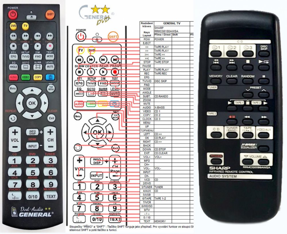 Náhradní dálkový ovladač SHARP RRMCG0099AWSA - 100% náhrada 1:1 za originální dálkový ovladač. Dálkový ovladač je určen pro tyto modely SHARP:CD-C2700, CD-C410H, CDC2700, CDC2700C, CDC2800, CDC2800C, CDC410H, CDC420, CDC420C, CDC422, CDC422C, CMSR550AV, CPC420, MUSIC CENTER CD-C265X, MUSIC CENTER CD-C430H, MUSIC CENTER CP-C430H. (Nemusí zde být uvedeny úplně všechny kompatibilní modely. Pokud si nejste jisti, sdělte nám svůj model (použijte online chat, e-mail, telefon), neprodleně zkontrolujeme a ověříme, zda je tento ovladač kompatibilní s Vaším přístrojem. Za poskytnutou informaci ručíme.) Ovladač je dodáván ve verzi značkového dálkového ovladače General DVD/AUDIO (zobrazen vlevo). Garantujeme Vám, že dostanete ovladač, který plně nahradí Váš původní originální ovladač a bude mít naprosto všechny funkce stejné.Není to univerzální ovladač, ale ovladač, který je naprogramován a přímo určen pro modely přístrojů uvedené výše. Není třeba žádné párování, žádné kódy. Obdržíte od nás ovladač, který je připraven k použití - jediné, co musíte udělat, je vložit baterie a ovladač hned funguje. Podívejte se na obrázek ovladače a ujistěte se, že jsou v tabulce všechny funkce jako na původním originálním ovladači. Jedná se o plnohodnotný náhradní dálkový ovladač (není to „univerzál“). Má naprosto všechny funkce přesně jako originální ovladač. Záruční lhůta na ovladač je 3 roky. Dodáván také jednoduchý návod s mapováním funkcí. DOPLŇKOVÁ FUNKCE: Tento dálkový ovladač je možno naprogramovat na 1 další přístroj. Budete moci jedním ovladačem ovládat oba přístroje (např. DVD+TV nebo SOUNDBAR+TV apod.). Pokud nám do komentáře v objednávce napíšete model dalšího přístroje, naprogramujeme Vám ovladač na oba. Za tuto doplňkovou službu bude naúčtován příplatek k ceně ovladače 50 Kč: více informací