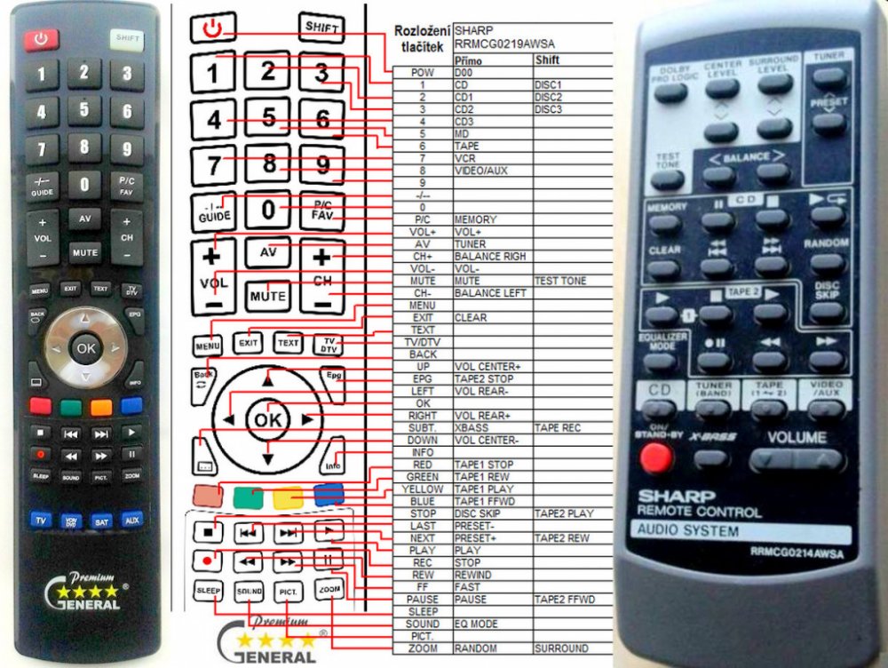 Náhradní dálkový ovladač SHARP RRMCG0219AWSA - 100procent náhrada 1:1 za originální dálkový ovladač. Dálkový ovladač je určen pro tyto modely SHARP: CDBA150, CDBA1500H, CDBA1600, CDBA1700, CDBA200, CDBA2100, CDBA2600. (Nemusí zde být uvedeny úplně všechny kompatibilní modely. Pokud si nejste jisti, sdělte nám svůj model (použijte online chat, e-mail, telefon), neprodleně zkontrolujeme a ověříme, zda je tento ovladač kompatibilní s Vaším přístrojem. Za poskytnutou informaci ručíme.) Ovladač je dodáván ve verzi značkového dálkového ovladače General Premium (zobrazen vlevo). Garantujeme Vám, že dostanete ovladač, který plně nahradí Váš původní originální ovladač a bude mít naprosto všechny funkce. Není to univerzální ovladač, ale ovladač, který je naprogramován a přímo určen pro modely přístrojů uvedené výše. Není třeba žádné párování, žádné kódy. Obdržíte od nás ovladač, který je připraven k použití - jediné, co musíte udělat, je vložit baterie a ovladač hned funguje. Podívejte se na obrázek ovladače a ujistěte se, že jsou v tabulce všechny funkce jako na původním originálním ovladači. Jedná se o plnohodnotný náhradní dálkový ovladač (není to „univerzál“). Má naprosto všechny funkce přesně jako originální ovladač. Záruční lhůta na ovladač je 2 roky. Dodáván také jednoduchý návod s mapováním funkcí. DOPLŇKOVÁ FUNKCE: Tento dálkový ovladač je možno naprogramovat na 1-4 zařízení (celkem tedy 4). Budete moci jedním ovladačem ovládat několik různých přístrojů jedním ovladačem. Pokud nám do komentáře v objednávce napíšete modely dalších přístrojů, naprogramujeme Vám ovladač na všechny. Za tuto doplňkovou službu bude naúčtován příplatek k ceně ovladače 50 Kč: více informací V případě, že v budoucnu vyměníte/obměníte Vaši domácí elektroniku, jsme schopni Vám tento ovladač přeprogramovat na naprosto jakékoliv nové/á zařízení. Ovladač General přežije Váš stávající přístroj!