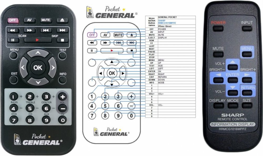 Náhradní dálkový ovladač SHARP RRMCG1016MPPZ - 100% náhrada 1:1 za originální dálkový ovladač. Dálkový ovladač byl vyvinut speciálně na míru pro tyto modely značky SHARP:PN-U423, PN60TA3, PN60TB3, PN70TB3, PNL603A, PNL603B, PNR903, PNR903E, PNU423. (Nemusí zde být uvedeny úplně všechny kompatibilní modely. Pokud si nejste jisti, sdělte nám svůj model (použijte online chat, e-mail, telefon), neprodleně zkontrolujeme a ověříme, zda je tento ovladač kompatibilní s Vaším přístrojem. Za poskytnutou informaci ručíme.) Ovladač je dodáván ve verzi značkového dálkového ovladače General POCKET (zobrazen vlevo). Garantujeme Vám, že dostanete ovladač, který plně nahradí Váš původní originální ovladač a bude mít naprosto všechny funkce stejné.Není to univerzální ovladač, ale ovladač, který je naprogramován a přímo určen pro modely přístrojů uvedené výše. Není třeba žádné párování, žádné kódy. Obdržíte od nás ovladač, který je připraven k použití - jediné, co musíte udělat, je vložit baterie a ovladač hned funguje. Podívejte se na obrázek ovladače a ujistěte se, že jsou v tabulce všechny funkce jako na původním originálním ovladači. Jedná se o plnohodnotný náhradní dálkový ovladač (není to „univerzál“). Má naprosto všechny funkce přesně jako originální ovladač. Záruční lhůta na ovladač je 3 roky. Dodáván také jednoduchý návod s mapováním funkcí.