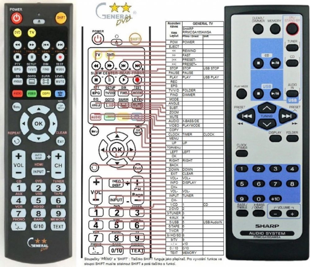 Náhradní dálkový ovladač SHARP RRMCGA165AWSA - 100procent náhrada 1:1 za originální dálkový ovladač. Dálkový ovladač je určen pro tyto modely SHARP: XL-E2180, XL-E25H, XL-UH25H, XLE2180, XLE25H, XLUH25H. (Nemusí zde být uvedeny úplně všechny kompatibilní modely. Pokud si nejste jisti, sdělte nám svůj model (použijte online chat, e-mail, telefon), neprodleně zkontrolujeme a ověříme, zda je tento ovladač kompatibilní s Vaším přístrojem. Za poskytnutou informaci ručíme.) Ovladač je dodáván ve verzi značkového dálkového ovladače General DVD/AUDIO (zobrazen vlevo). Garantujeme Vám, že dostanete ovladač, který plně nahradí Váš původní originální ovladač a bude mít naprosto všechny funkce. Není to univerzální ovladač, ale ovladač, který je naprogramován a přímo určen pro modely přístrojů uvedené výše. Není třeba žádné párování, žádné kódy. Obdržíte od nás ovladač, který je připraven k použití - jediné, co musíte udělat, je vložit baterie a ovladač hned funguje. Podívejte se na obrázek ovladače a ujistěte se, že jsou v tabulce všechny funkce jako na původním originálním ovladači. Jedná se o plnohodnotný náhradní dálkový ovladač (není to „univerzál“). Má naprosto všechny funkce přesně jako originální ovladač. Záruční lhůta na ovladač je 2 roky. Dodáván také jednoduchý návod s mapováním funkcí. DOPLŇKOVÁ FUNKCE: Tento dálkový ovladač je možno naprogramovat na 1 další přístroj. Budete moci jedním ovladačem ovládat oba přístroje (např. DVD plus TV nebo SOUNDBAR plus TV apod.). Pokud nám do komentáře v objednávce napíšete model dalšího přístroje, naprogramujeme Vám ovladač na oba. Za tuto doplňkovou službu bude naúčtován příplatek k ceně ovladače 50 Kč: více informací