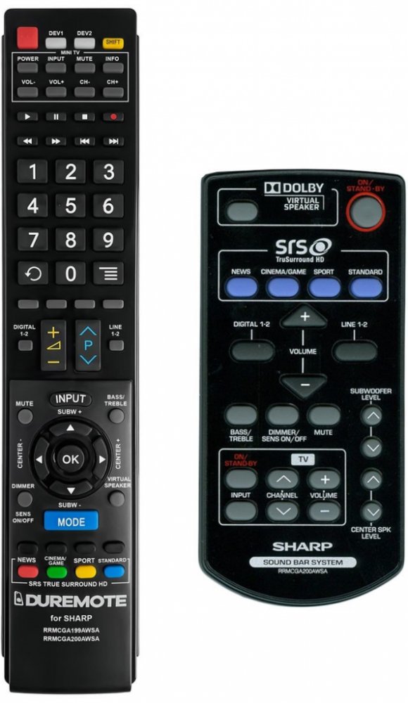 Dálkový ovladač SHARP RRMCGA200AWSA duplikát 1:1 originálního dálkového ovladače. Dokonalá 1:1 kopie navržená a vyrobená naší firmou – má všechny funkce originálního ovladače pro tyto modely značky SHARP:HT-SB500, HT-SB600, HTSB500. (Nemusí zde být uvedeny úplně všechny kompatibilní modely. Pokud si nejste jisti, sdělte nám svůj model (použijte online chat, e-mail, telefon), neprodleně zkontrolujeme a ověříme, zda je tento ovladač kompatibilní s Vaším přístrojem. Za poskytnutou informaci ručíme.) Dálkový ovladač General Duremote má naprosto všechny funkce a popisky tlačítek stejné jako originální dálkový ovladač. Není třeba nic nastavovat, žádné kódy, funguje ihned po vložení baterií se všemi výše uvedenými modely.Ovladač je dodáván ve verzi značkového dálkového ovladače General Duremote (zobrazen vlevo)DUPLIKÁT 2 v 1: Tento ovladač má sekci tlačítek MINI-TV pro funkce, které jej můžete naučit z Vašeho TV ovladače. To znamená, že jedním ovladačem můžete ovládat 2 přístroje, například set top box + základní funkce TV. Způsob učení tlačítek naleznete v přiloženém návodu v krabičce, ve které Vám bude ovladač dodán.Jedná se o ovladač vyrobený pro specifické zařízení – NENÍ to univerzální ovladač!Má naprosto všechny funkce jako originální dálkový ovladač.Má stejné popisky tlačítek, jako jste byli zvyklí z originálu.Popisky tlačítek jsou velmi odolné a nejdou seškrábat ani hrubou silou.3 roky záruka.Nulová poruchovost tohoto modelu! Nemáme zádné reklamace a přitom je to náš nejprodávanější ovladač.General Duremote byl tlačítko po tlačítku navržen a vyroben přesně podle originálního dálkového ovladače na obrázku vpravo. Výroben v naší firmě v Ostravě, vývoj, výroba i atesty v České republice - splňuje CE a ROHS standardy.SNADNÉ INTUITIVNÍ POUŽÍVÁNÍ: Na rozdíl od běžných náhradních ovladačů, General Duremote má 100% stejné popisky tlačítek jako Váš původní originální dálkový ovladač.Srovnání: Ostatní univerzální nebo programovatelné náhrady mají (kvůli úspoře nákladů) univerzální rozložení s nesprávně ozn..