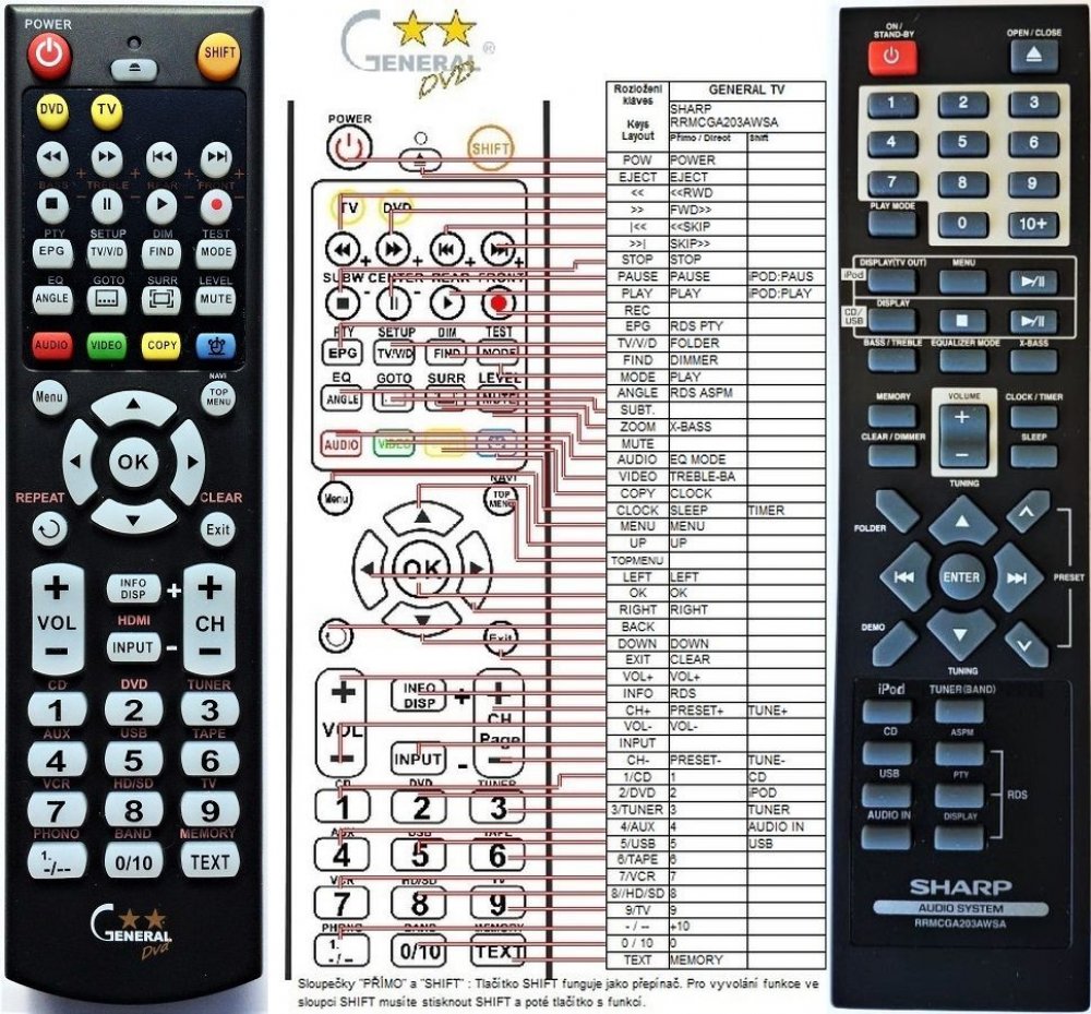 Náhradní dálkový ovladač SHARP RRMCGA203AWSA - 100procent náhrada 1:1 za originální dálkový ovladač. Dálkový ovladač je určen pro tyto modely SHARP: XL-DH350, XLDH350. (Nemusí zde být uvedeny úplně všechny kompatibilní modely. Pokud si nejste jisti, sdělte nám svůj model (použijte online chat, e-mail, telefon), neprodleně zkontrolujeme a ověříme, zda je tento ovladač kompatibilní s Vaším přístrojem. Za poskytnutou informaci ručíme.) Ovladač je dodáván ve verzi značkového dálkového ovladače General DVD/AUDIO (zobrazen vlevo). Garantujeme Vám, že dostanete ovladač, který plně nahradí Váš původní originální ovladač a bude mít naprosto všechny funkce. Není to univerzální ovladač, ale ovladač, který je naprogramován a přímo určen pro modely přístrojů uvedené výše. Není třeba žádné párování, žádné kódy. Obdržíte od nás ovladač, který je připraven k použití - jediné, co musíte udělat, je vložit baterie a ovladač hned funguje. Podívejte se na obrázek ovladače a ujistěte se, že jsou v tabulce všechny funkce jako na původním originálním ovladači. Jedná se o plnohodnotný náhradní dálkový ovladač (není to „univerzál“). Má naprosto všechny funkce přesně jako originální ovladač. Záruční lhůta na ovladač je 2 roky. Dodáván také jednoduchý návod s mapováním funkcí. DOPLŇKOVÁ FUNKCE: Tento dálkový ovladač je možno naprogramovat na 1 další přístroj. Budete moci jedním ovladačem ovládat oba přístroje (např. DVD plus TV nebo SOUNDBAR plus TV apod.). Pokud nám do komentáře v objednávce napíšete model dalšího přístroje, naprogramujeme Vám ovladač na oba. Za tuto doplňkovou službu bude naúčtován příplatek k ceně ovladače 50 Kč: více informací