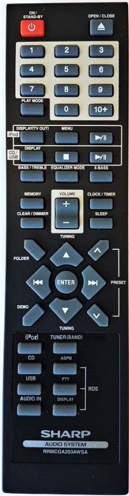 Náhradní dálkový ovladač SHARP RRMCGA203AWSA - 100procent náhrada 1:1 za originální dálkový ovladač. Dálkový ovladač je určen pro tyto modely SHARP: XL-DH350, XLDH350. (Nemusí zde být uvedeny úplně všechny kompatibilní modely. Pokud si nejste jisti, sdělte nám svůj model (použijte online chat, e-mail, telefon), neprodleně zkontrolujeme a ověříme, zda je tento ovladač kompatibilní s Vaším přístroje...