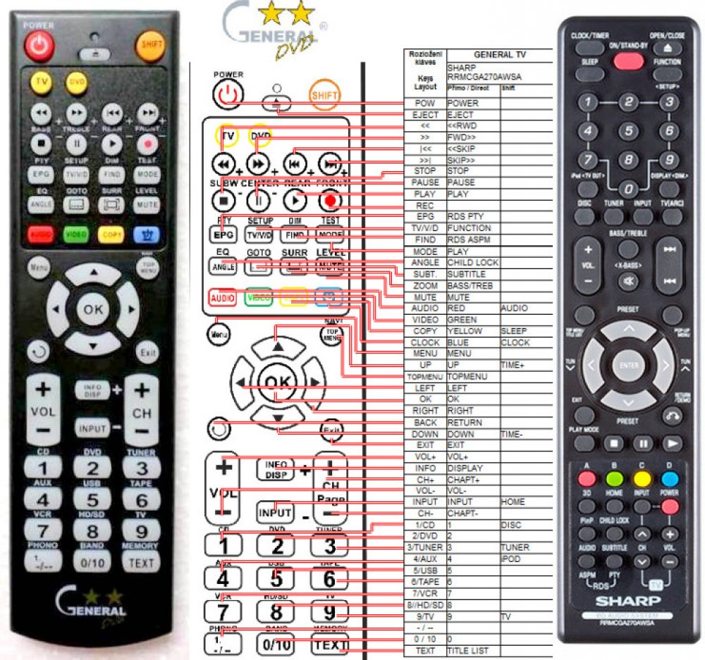 Náhradní dálkový ovladač SHARP RRMCGA270AWSA - 100% náhrada 1:1 za originální dálkový ovladač. Dálkový ovladač byl vyvinut speciálně na míru pro tyto modely značky SHARP:XL-BD601PH. (Nemusí zde být uvedeny úplně všechny kompatibilní modely. Pokud si nejste jisti, sdělte nám svůj model (použijte online chat, e-mail, telefon), neprodleně zkontrolujeme a ověříme, zda je tento ovladač kompatibilní s Vaším přístrojem. Za poskytnutou informaci ručíme.) Ovladač je dodáván ve verzi značkového dálkového ovladače General DVD/AUDIO (zobrazen vlevo). Garantujeme Vám, že dostanete ovladač, který plně nahradí Váš původní originální ovladač a bude mít naprosto všechny funkce stejné.Není to univerzální ovladač, ale ovladač, který je naprogramován a přímo určen pro modely přístrojů uvedené výše. Není třeba žádné párování, žádné kódy. Obdržíte od nás ovladač, který je připraven k použití - jediné, co musíte udělat, je vložit baterie a ovladač hned funguje. Podívejte se na obrázek ovladače a ujistěte se, že jsou v tabulce všechny funkce jako na původním originálním ovladači. Jedná se o plnohodnotný náhradní dálkový ovladač (není to „univerzál“). Má naprosto všechny funkce přesně jako originální ovladač. Záruční lhůta na ovladač je 3 roky. Dodáván také jednoduchý návod s mapováním funkcí. DOPLŇKOVÁ FUNKCE: Tento dálkový ovladač je možno naprogramovat na 1 další přístroj. Budete moci jedním ovladačem ovládat oba přístroje (např. DVD+TV nebo SOUNDBAR+TV apod.). Pokud nám do komentáře v objednávce napíšete model dalšího přístroje, naprogramujeme Vám ovladač na oba. Za tuto doplňkovou službu bude naúčtován příplatek k ceně ovladače 50 Kč: více informací
