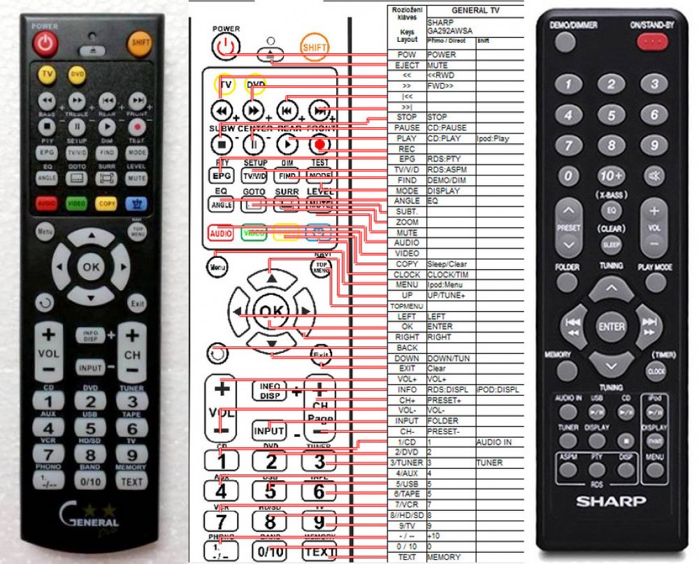 Náhradní dálkový ovladač SHARP RRMCGA291AWSA, RRMCGA292AWSA - 100procent náhrada 1:1 za originální dálkový ovladač. Dálkový ovladač je určen pro tyto modely SHARP: CD-DA1300, CD-DA1500, GX-M10H. (Nemusí zde být uvedeny úplně všechny kompatibilní modely. Pokud si nejste jisti, sdělte nám svůj model (použijte online chat, e-mail, telefon), neprodleně zkontrolujeme a ověříme, zda je tento ovladač kompatibilní s Vaším přístrojem. Za poskytnutou informaci ručíme.) Ovladač je dodáván ve verzi značkového dálkového ovladače General DVD/AUDIO (zobrazen vlevo). Garantujeme Vám, že dostanete ovladač, který plně nahradí Váš původní originální ovladač a bude mít naprosto všechny funkce. Není to univerzální ovladač, ale ovladač, který je naprogramován a přímo určen pro modely přístrojů uvedené výše. Není třeba žádné párování, žádné kódy. Obdržíte od nás ovladač, který je připraven k použití - jediné, co musíte udělat, je vložit baterie a ovladač hned funguje. Podívejte se na obrázek ovladače a ujistěte se, že jsou v tabulce všechny funkce jako na původním originálním ovladači. Jedná se o plnohodnotný náhradní dálkový ovladač (není to „univerzál“). Má naprosto všechny funkce přesně jako originální ovladač. Záruční lhůta na ovladač je 2 roky. Dodáván také jednoduchý návod s mapováním funkcí. DOPLŇKOVÁ FUNKCE: Tento dálkový ovladač je možno naprogramovat na 1 další přístroj. Budete moci jedním ovladačem ovládat oba přístroje (např. DVD plus TV nebo SOUNDBAR plus TV apod.). Pokud nám do komentáře v objednávce napíšete model dalšího přístroje, naprogramujeme Vám ovladač na oba. Za tuto doplňkovou službu bude naúčtován příplatek k ceně ovladače 50 Kč: více informací