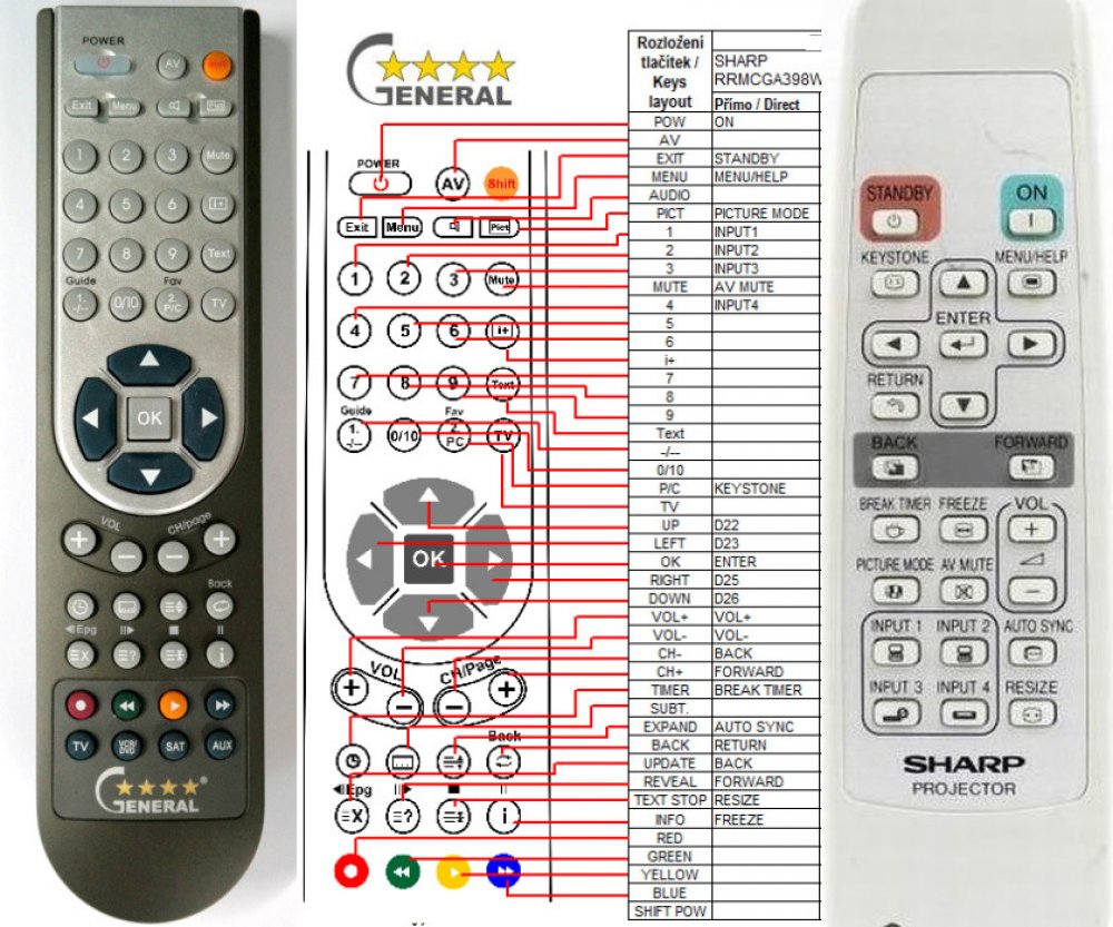 Náhradní dálkový ovladač SHARP RRMCGA398WJSA - 100% náhrada 1:1 za originální dálkový ovladač. Dálkový ovladač byl vyvinut speciálně na míru pro tyto modely značky SHARP:20X-XR, PG-A20X, PGA20X, PGMB56X, PGMB66X, XGMB50X, XGMB50XL, XGMB65X, XGMB67X, XR10S, XR10X, XR10XL, XR11XC, XR20S, XR20X, XR20X.. (Nemusí zde být uvedeny úplně všechny kompatibilní modely. Pokud si nejste jisti, sdělte nám svůj model (použijte online chat, e-mail, telefon), neprodleně zkontrolujeme a ověříme, zda je tento ovladač kompatibilní s Vaším přístrojem. Za poskytnutou informaci ručíme.) Ovladač je dodáván ve verzi značkového dálkového ovladače General LASER (zobrazen vlevo). Garantujeme Vám, že dostanete ovladač, který plně nahradí Váš původní originální ovladač a bude mít naprosto všechny funkce stejné.Není to univerzální ovladač, ale ovladač, který je naprogramován a přímo určen pro modely projektorů uvedené výše. Není třeba žádné párování, žádné kódy. Obdržíte od nás ovladač, který je připraven k použití - jediné, co musíte udělat, je vložit baterie a ovladač hned funguje. Jedná se o plnohodnotný náhradní dálkový ovladač speciálně navržen pro projektory (není to „univerzál“). Má naprosto všechny funkce přesně jako originální ovladač. Ovladač má přidanou funkci LASEROVÉ UKAZOVÁTKO. Dodáván také jednoduchý návod s mapováním funkcí.V případě, že v budoucnu vyměníte Váš projektor za jinou značku/model, jsme schopni Vám tento ovladač přeprogramovat na naprosto jakékoliv nové/á zařízení. Ovladač General LASER přežije Váš stávající přístroj!