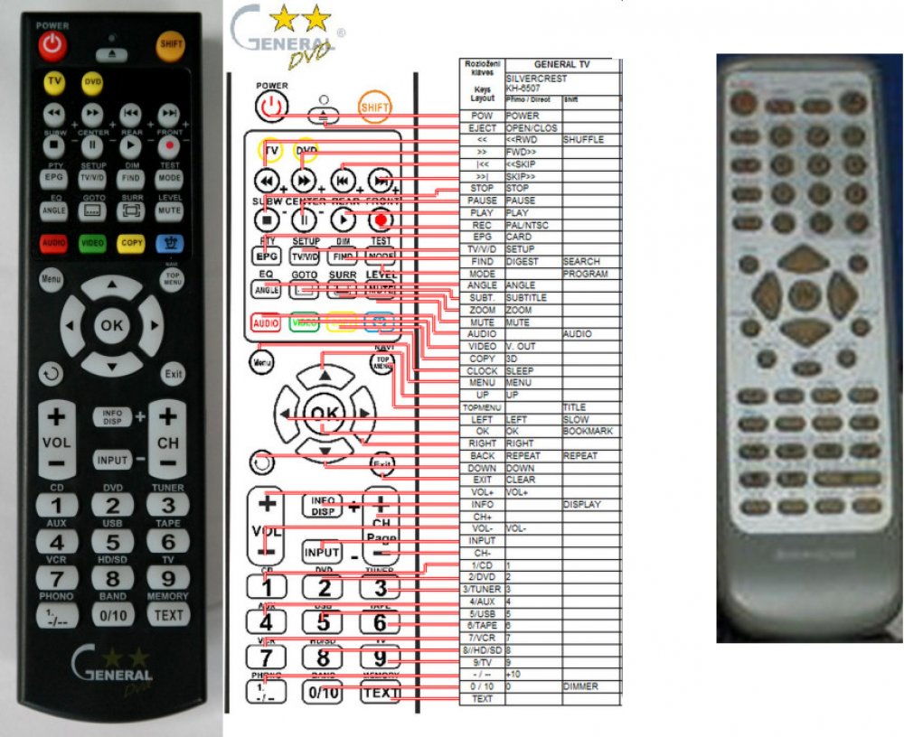 Náhradní dálkový ovladač SILVERCREST KH-6507 (KH6507) - 100procent náhrada 1:1 za originální dálkový ovladač. Dálkový ovladač je určen pro tyto modely SILVERCREST: KH-6507, KH6507. (Nemusí zde být uvedeny úplně všechny kompatibilní modely. Pokud si nejste jisti, sdělte nám svůj model (použijte online chat, e-mail, telefon), neprodleně zkontrolujeme a ověříme, zda je tento ovladač kompatibilní s Vaším přístrojem. Za poskytnutou informaci ručíme.) Ovladač je dodáván ve verzi značkového dálkového ovladače General DVD/AUDIO (zobrazen vlevo). Garantujeme Vám, že dostanete ovladač, který plně nahradí Váš původní originální ovladač a bude mít naprosto všechny funkce. Není to univerzální ovladač, ale ovladač, který je naprogramován a přímo určen pro modely přístrojů uvedené výše. Není třeba žádné párování, žádné kódy. Obdržíte od nás ovladač, který je připraven k použití - jediné, co musíte udělat, je vložit baterie a ovladač hned funguje. Podívejte se na obrázek ovladače a ujistěte se, že jsou v tabulce všechny funkce jako na původním originálním ovladači. Jedná se o plnohodnotný náhradní dálkový ovladač (není to „univerzál“). Má naprosto všechny funkce přesně jako originální ovladač. Záruční lhůta na ovladač je 2 roky. Dodáván také jednoduchý návod s mapováním funkcí. DOPLŇKOVÁ FUNKCE: Tento dálkový ovladač je možno naprogramovat na 1 další přístroj. Budete moci jedním ovladačem ovládat oba přístroje (např. DVD plus TV nebo SOUNDBAR plus TV apod.). Pokud nám do komentáře v objednávce napíšete model dalšího přístroje, naprogramujeme Vám ovladač na oba. Za tuto doplňkovou službu bude naúčtován příplatek k ceně ovladače 50 Kč: více informací