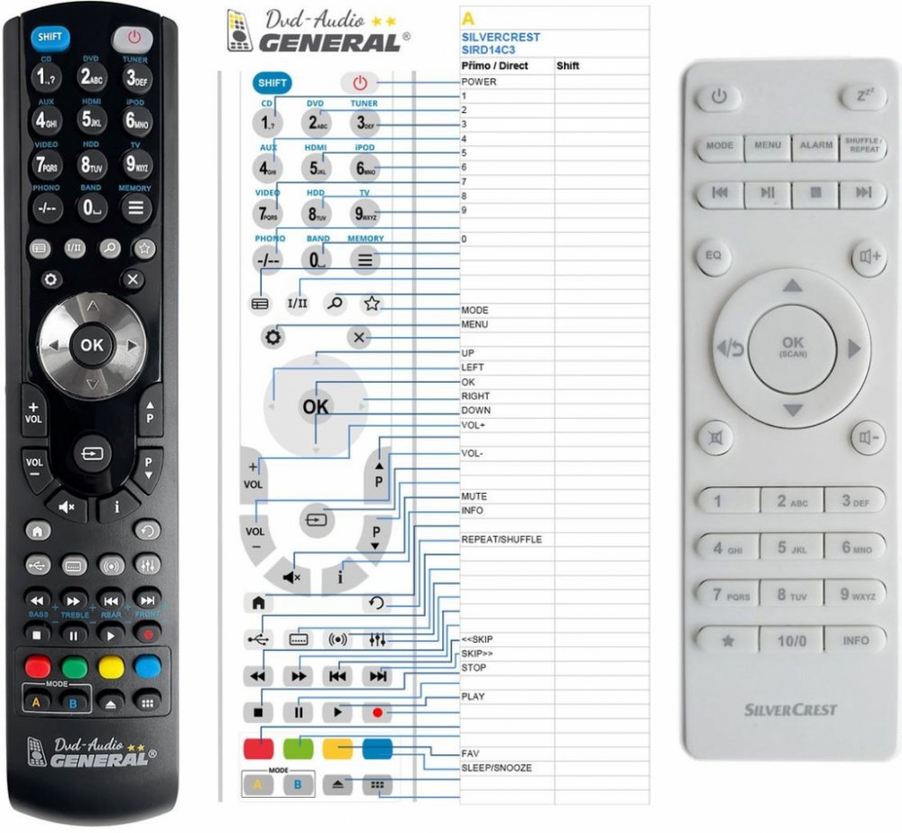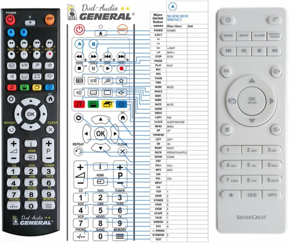 Náhradní dálkový ovladač SILVERCREST SIRD14C3, SIRD14C4 - 100% náhrada 1:1 za originální dálkový ovladač. Dálkový ovladač byl vyvinut speciálně na míru pro tyto modely značky SILVERCREST:SIRD-14-C3, SIRD-14-C4, SIRD14C3, SIRD14C4. (Nemusí zde být uvedeny úplně všechny kompatibilní modely. Pokud si nejste jisti, sdělte nám svůj model (použijte online chat, e-mail, telefon), neprodleně zkontrolujeme a ověříme, zda je tento ovladač kompatibilní s Vaším přístrojem. Za poskytnutou informaci ručíme.) Ovladač je dodáván ve verzi značkového dálkového ovladače General DVD/AUDIO (zobrazen vlevo). Garantujeme Vám, že dostanete ovladač, který plně nahradí Váš původní originální ovladač a bude mít naprosto všechny funkce stejné.Není to univerzální ovladač, ale ovladač, který je naprogramován a přímo určen pro modely přístrojů uvedené výše. Není třeba žádné párování, žádné kódy. Obdržíte od nás ovladač, který je připraven k použití - jediné, co musíte udělat, je vložit baterie a ovladač hned funguje. Podívejte se na obrázek ovladače a ujistěte se, že jsou v tabulce všechny funkce jako na původním originálním ovladači. Jedná se o plnohodnotný náhradní dálkový ovladač (není to „univerzál“). Má naprosto všechny funkce přesně jako originální ovladač. Záruční lhůta na ovladač je 3 roky. Dodáván také jednoduchý návod s mapováním funkcí. DOPLŇKOVÁ FUNKCE: Tento dálkový ovladač je možno naprogramovat na 1 další přístroj. Budete moci jedním ovladačem ovládat oba přístroje (např. DVD+TV nebo SOUNDBAR+TV apod.). Pokud nám do komentáře v objednávce napíšete model dalšího přístroje, naprogramujeme Vám ovladač na oba. Za tuto doplňkovou službu bude naúčtován příplatek k ceně ovladače 50 Kč: více informací