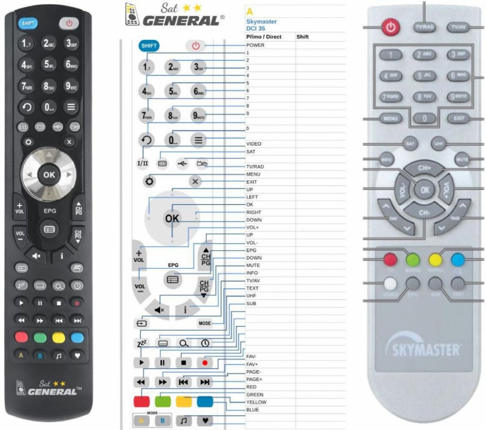 Náhradní dálkový ovladač SKYMASTER DCI 35 - 100% náhrada 1:1 za originální dálkový ovladač. Dálkový ovladač je určen pro tyto modely :DCI 35. (Nemusí zde být uvedeny úplně všechny kompatibilní modely. Pokud si nejste jisti, sdělte nám svůj model (e-mail, telefon), neprodleně zkontrolujeme a ověříme, zda je tento ovladač kompatibilní s Vaším přístrojem. Za poskytnutou informaci ručíme.) Ovladač je