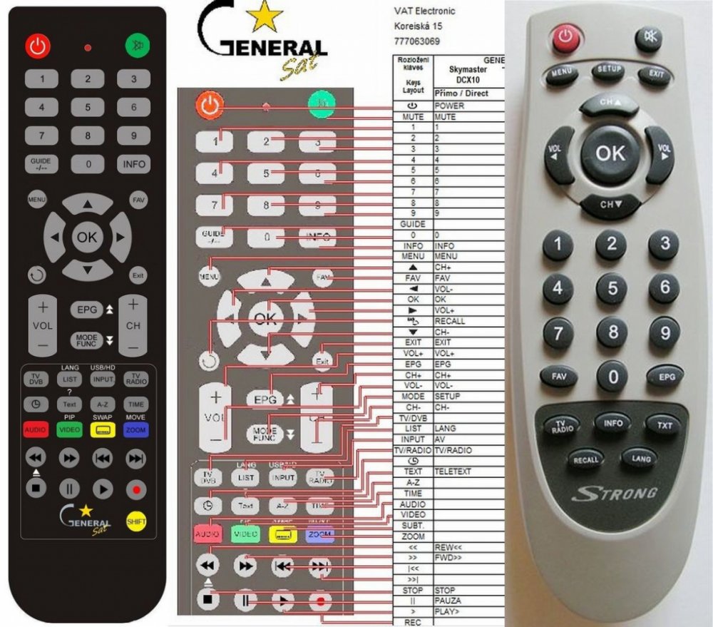 Náhradní dálkový ovladač SKYMASTER DCX10CI - 100% náhrada 1:1 za originální dálkový ovladač. Dálkový ovladač byl vyvinut speciálně na míru pro tyto modely značky SKYMASTER:DCX10, DCX10CI. (Nemusí zde být uvedeny úplně všechny kompatibilní modely. Pokud si nejste jisti, sdělte nám svůj model (použijte online chat, e-mail, telefon), neprodleně zkontrolujeme a ověříme, zda je tento ovladač kompatibilní s Vaším přístrojem. Za poskytnutou informaci ručíme.) Ovladač je dodáván ve verzi značkového dálkového ovladače General SAT/TV (zobrazen vlevo). Garantujeme Vám, že dostanete ovladač, který plně nahradí Váš původní originální ovladač a bude mít naprosto všechny funkce stejné.Není to univerzální ovladač, ale ovladač, který je naprogramován a přímo určen pro modely přístrojů uvedené výše. Není třeba žádné párování, žádné kódy. Obdržíte od nás ovladač, který je připraven k použití - jediné, co musíte udělat, je vložit baterie a ovladač hned funguje. Podívejte se na obrázek ovladače a ujistěte se, že jsou v tabulce všechny funkce jako na původním originálním ovladači. Jedná se o plnohodnotný náhradní dálkový ovladač (není to „univerzál“). Má naprosto všechny funkce přesně jako originální ovladač. Záruční lhůta na ovladač je 3 roky. Dodáván také jednoduchý návod s mapováním funkcí. DOPLŇKOVÁ FUNKCE: Tento dálkový ovladač je možno naprogramovat na 1 další přístroj. Budete moci jedním ovladačem ovládat oba přístroje (např. SAT+TV nebo SAT+DVD apod). Pokud nám do komentáře v objednávce napíšete model dalšího přístroje, naprogramujeme Vám ovladač na oba. Za tuto doplňkovou službu bude naúčtován příplatek k ceně ovladače 50 Kč: více informací