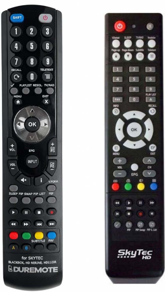 Dálkový ovladač SKYTEC HD110IR FORTIS duplikát 1:1 originálního dálkového ovladače. Dokonalá 1:1 kopie navržená a vyrobená naší firmou – má všechny funkce originálního ovladače pro tyto modely značky SKYTEC:BLACKBOX, HD NERINE, HD-NERINE, NERINE. (Nemusí zde být uvedeny úplně všechny kompatibilní modely. Pokud si nejste jisti, sdělte nám svůj model (použijte online chat, e-mail, telefon), neprodleně zkontrolujeme a ověříme, zda je tento ovladač kompatibilní s Vaším přístrojem. Za poskytnutou informaci ručíme.) Dálkový ovladač General Duremote má naprosto všechny funkce a popisky tlačítek stejné jako originální dálkový ovladač. Není třeba nic nastavovat, žádné kódy, funguje ihned po vložení baterií se všemi výše uvedenými modely.Ovladač je dodáván ve verzi značkového dálkového ovladače General Duremote (zobrazen vlevo)Jedná se o ovladač vyrobený pro specifické zařízení – NENÍ to univerzální ovladač!Má naprosto všechny funkce jako originální dálkový ovladač.Má stejné popisky tlačítek, jako jste byli zvyklí z originálu.Popisky tlačítek jsou velmi odolné a nejdou seškrábat ani hrubou silou.3 roky záruka.Nulová poruchovost tohoto modelu! Nemáme zádné reklamace a přitom je to náš nejprodávanější ovladač.General Duremote byl tlačítko po tlačítku navržen a vyroben přesně podle originálního dálkového ovladače na obrázku vpravo. Výroben v naší firmě v Ostravě, vývoj, výroba i atesty v České republice - splňuje CE a ROHS standardy.SNADNÉ INTUITIVNÍ POUŽÍVÁNÍ: Na rozdíl od běžných náhradních ovladačů, General Duremote má 100% stejné popisky tlačítek jako Váš původní originální dálkový ovladač.Srovnání: Ostatní univerzální nebo programovatelné náhrady mají (kvůli úspoře nákladů) univerzální rozložení s nesprávně označenými tlačítky, a proto potřebují návod (tabulku funkcí), který říká, jaká je skutečná funkce jednotlivých tlačítek. To může způsobovat zmatek a nutnost neustálého vracení se k návodu je pro koncového uživatele obtěžující. Naopak při používání našeho dálkového ovladače General Duremot..