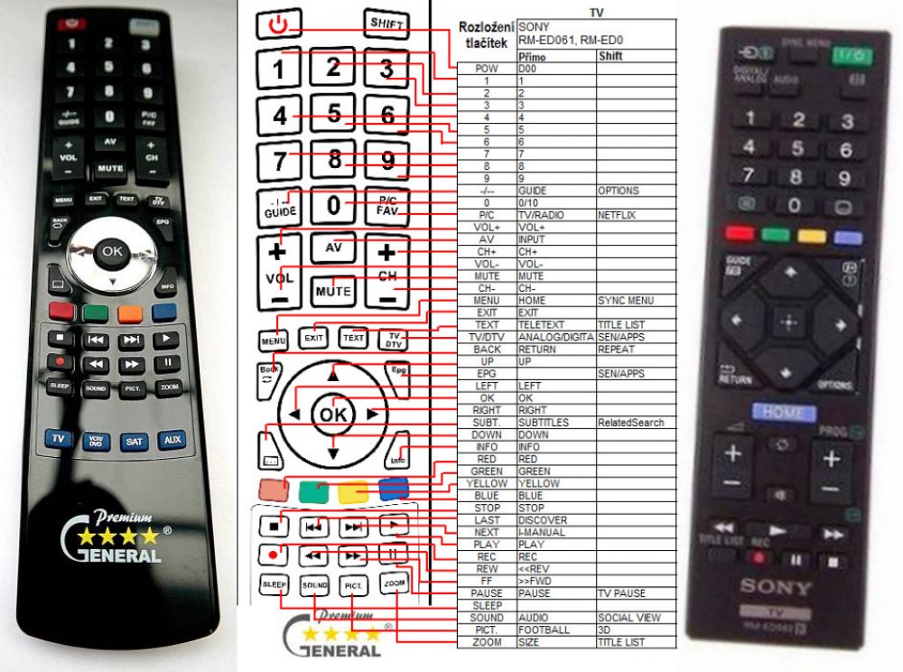 Doplňková funkce: General PREMIUM Vám můžeme kromě poptávaného zařízení také naprogramovat na další 3 zařízení (celkem tedy 4) např. TV , DVD, VCR, DVB-T, SAT, AUDIO, Hi-Fi, domácí kino atd., jelikož naše databáze kódu je více než obsáhlá a neustále se rozšiřuje.
