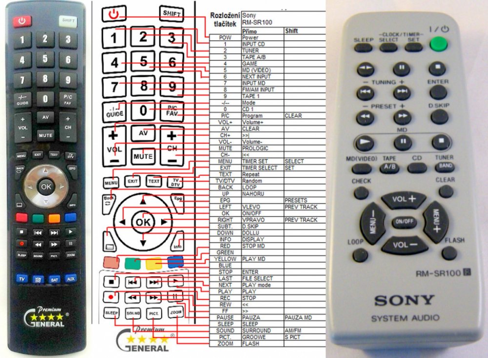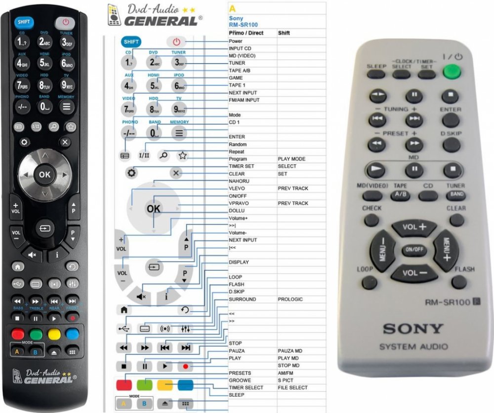 Náhradní dálkový ovladač SONY RM-SR100 (RMSR100) - 100% náhrada 1:1 za originální dálkový ovladač. Dálkový ovladač byl vyvinut speciálně na míru pro tyto modely značky SONY:CMT-RB5, HCD-BX3, HCD-BX5, HCD-BX9, HCD-DX3, HCD-DX5, HCD-DX5J, HCD-DX7, HCD-DX7J, HCD-DX9, HCD-X7, MHC-BX3, MHC-BX5, MHC-BX6AV, MHC-BX7, MHC-BX9, MHC-DX3, MHC-DX5, MHC-DX5J, MHC-DX7, MHC-DX7J, MHC-DX8, MHC-DX9, RM-SG10AV, RM-SRB5. (Nemusí zde být uvedeny úplně všechny kompatibilní modely. Pokud si nejste jisti, sdělte nám svůj model (použijte online chat, e-mail, telefon), neprodleně zkontrolujeme a ověříme, zda je tento ovladač kompatibilní s Vaším přístrojem. Za poskytnutou informaci ručíme.) Ovladač je dodáván ve verzi značkového dálkového ovladače General DVD/AUDIO (zobrazen vlevo). Garantujeme Vám, že dostanete ovladač, který plně nahradí Váš původní originální ovladač a bude mít naprosto všechny funkce stejné.Není to univerzální ovladač, ale ovladač, který je naprogramován a přímo určen pro modely přístrojů uvedené výše. Není třeba žádné párování, žádné kódy. Obdržíte od nás ovladač, který je připraven k použití - jediné, co musíte udělat, je vložit baterie a ovladač hned funguje. Podívejte se na obrázek ovladače a ujistěte se, že jsou v tabulce všechny funkce jako na původním originálním ovladači. Jedná se o plnohodnotný náhradní dálkový ovladač (není to „univerzál“). Má naprosto všechny funkce přesně jako originální ovladač. Záruční lhůta na ovladač je 3 roky. Dodáván také jednoduchý návod s mapováním funkcí. DOPLŇKOVÁ FUNKCE: Tento dálkový ovladač je možno naprogramovat na 1 další přístroj. Budete moci jedním ovladačem ovládat oba přístroje (např. DVD+TV nebo SOUNDBAR+TV apod.). Pokud nám do komentáře v objednávce napíšete model dalšího přístroje, naprogramujeme Vám ovladač na oba. Za tuto doplňkovou službu bude naúčtován příplatek k ceně ovladače 50 Kč: více informací