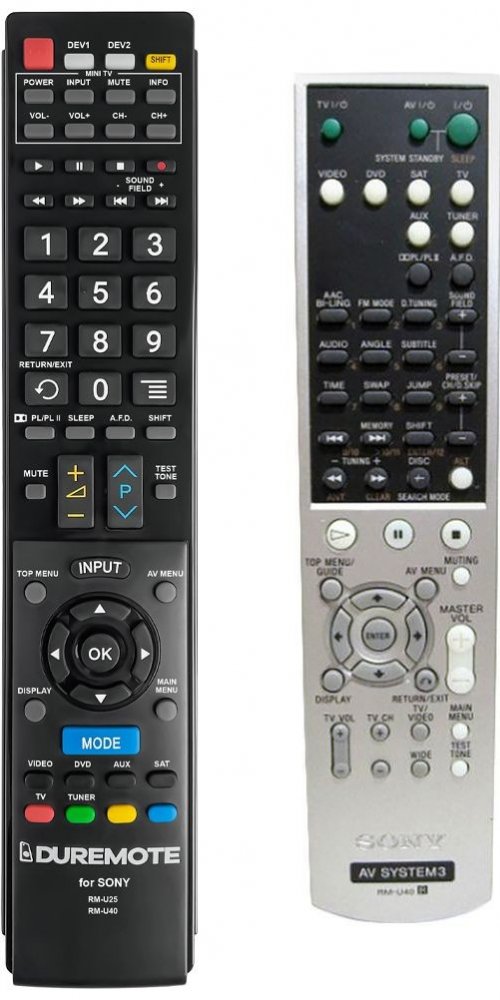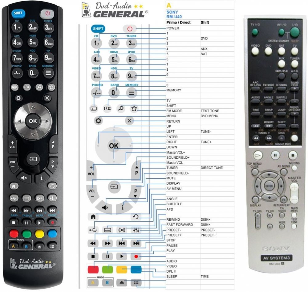 Náhradní dálkový ovladač SONY RM-U25, RM-U40 (RMU25, RMU40) - 100% náhrada 1:1 za originální dálkový ovladač. Dálkový ovladač je určen pro tyto modely SONY:HT-SL40, HT-SL50, HT-SL500, HT-SL55, HT-SL600, HT-SL700, HT-SL800, HTSL40, HTSL500, HTSL600, STR-KLS5, STR-KSL40, STR-KSL5, STR-KSL50, STR-KSL500, STR-KSL600, STR-KSL700, STR-KSL70SW, STR-SL500, STRD600, STRD600SS, STRD800SS, STRKLS5, STRKSL40, STRKSL500, STRKSL600, STRKSL700, STRKSL70SW. (Nemusí zde být uvedeny úplně všechny kompatibilní modely. Pokud si nejste jisti, sdělte nám svůj model (použijte online chat, e-mail, telefon), neprodleně zkontrolujeme a ověříme, zda je tento ovladač kompatibilní s Vaším přístrojem. Za poskytnutou informaci ručíme.)Plně nahrazuje také tyto dálkové ovladače: RM-U700Ovladač je dodáván ve verzi značkového dálkového ovladače General DVD/AUDIO (zobrazen vlevo). Garantujeme Vám, že dostanete ovladač, který plně nahradí Váš původní originální ovladač a bude mít naprosto všechny funkce.Není to univerzální ovladač, ale ovladač, který je naprogramován a přímo určen pro modely přístrojů uvedené výše. Není třeba žádné párování, žádné kódy. Obdržíte od nás ovladač, který je připraven k použití - jediné, co musíte udělat, je vložit baterie a ovladač hned funguje. Podívejte se na obrázek ovladače a ujistěte se, že jsou v tabulce všechny funkce jako na původním originálním ovladači. Jedná se o plnohodnotný náhradní dálkový ovladač (není to „univerzál“). Má naprosto všechny funkce přesně jako originální ovladač. Záruční lhůta na ovladač je 2 roky. Dodáván také jednoduchý návod s mapováním funkcí. DOPLŇKOVÁ FUNKCE: Tento dálkový ovladač je možno naprogramovat na 1 další přístroj. Budete moci jedním ovladačem ovládat oba přístroje (např. DVD+TV nebo SOUNDBAR+TV apod.). Pokud nám do komentáře v objednávce napíšete model dalšího přístroje, naprogramujeme Vám ovladač na oba. Za tuto doplňkovou službu bude naúčtován příplatek k ceně ovladače 50 Kč: více informací