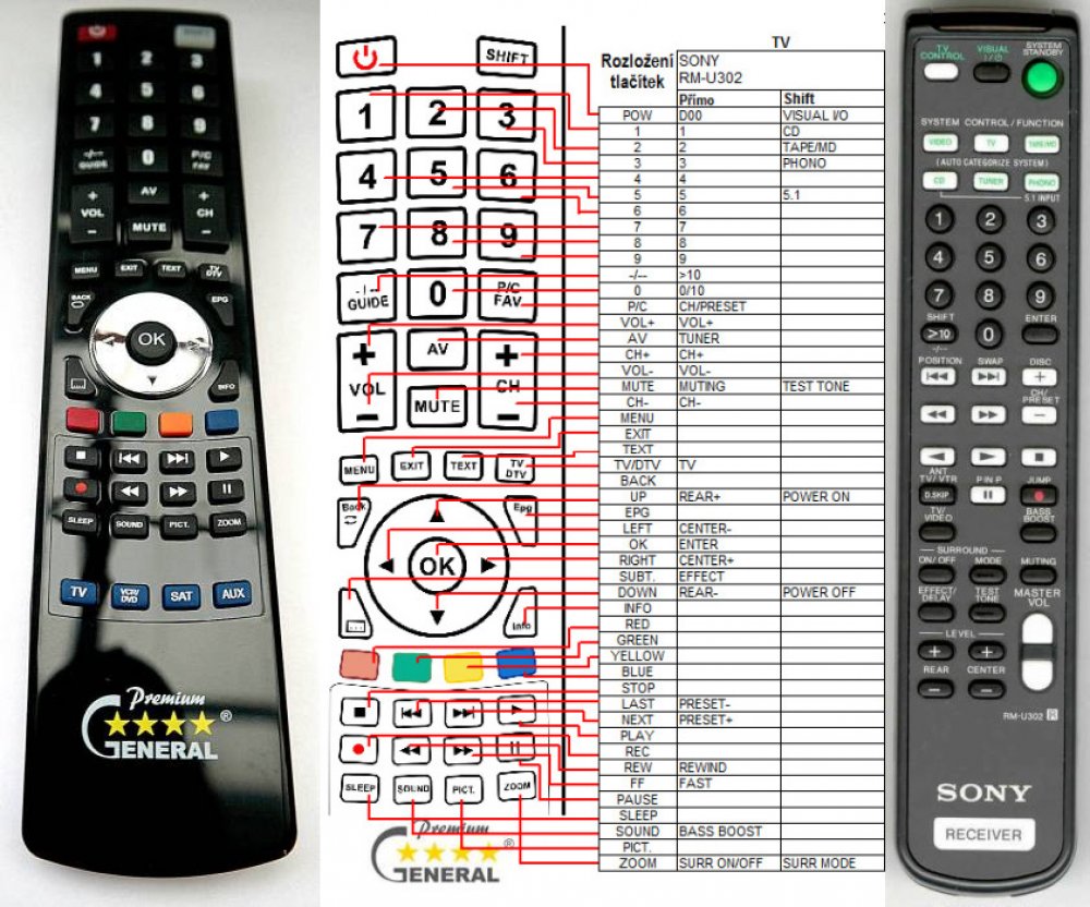 Tímto ovladačem RM-U302 lze nahradit nedostupný DO s označením RM-U581 (ověřeno) pro Sony Coloseum typ HST-SE581, TA-AV581 a dále jím můžete plně nahradit dalkové ovladače RM-U301 (Pro RXD-700), RM-U302, RM-U303 (chybí TEST TONE), RM-U305, RM-U252, RM-U263.