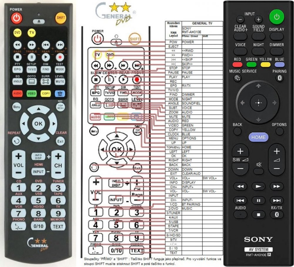 Náhradní dálkový ovladač SONY RMT-AH310E (RMTAH310E) - 100% náhrada 1:1 za originální dálkový ovladač. Dálkový ovladač byl vyvinut speciálně na míru pro tyto modely značky SONY:HT-ST5000, HTST5000. (Nemusí zde být uvedeny úplně všechny kompatibilní modely. Pokud si nejste jisti, sdělte nám svůj model (použijte online chat, e-mail, telefon), neprodleně zkontrolujeme a ověříme, zda je tento ovladač kompatibilní s Vaším přístrojem. Za poskytnutou informaci ručíme.) Ovladač je dodáván ve verzi značkového dálkového ovladače General DVD/AUDIO (zobrazen vlevo). Garantujeme Vám, že dostanete ovladač, který plně nahradí Váš původní originální ovladač a bude mít naprosto všechny funkce stejné.Není to univerzální ovladač, ale ovladač, který je naprogramován a přímo určen pro modely přístrojů uvedené výše. Není třeba žádné párování, žádné kódy. Obdržíte od nás ovladač, který je připraven k použití - jediné, co musíte udělat, je vložit baterie a ovladač hned funguje. Podívejte se na obrázek ovladače a ujistěte se, že jsou v tabulce všechny funkce jako na původním originálním ovladači. Jedná se o plnohodnotný náhradní dálkový ovladač (není to „univerzál“). Má naprosto všechny funkce přesně jako originální ovladač. Záruční lhůta na ovladač je 3 roky. Dodáván také jednoduchý návod s mapováním funkcí. DOPLŇKOVÁ FUNKCE: Tento dálkový ovladač je možno naprogramovat na 1 další přístroj. Budete moci jedním ovladačem ovládat oba přístroje (např. DVD+TV nebo SOUNDBAR+TV apod.). Pokud nám do komentáře v objednávce napíšete model dalšího přístroje, naprogramujeme Vám ovladač na oba. Za tuto doplňkovou službu bude naúčtován příplatek k ceně ovladače 50 Kč: více informací