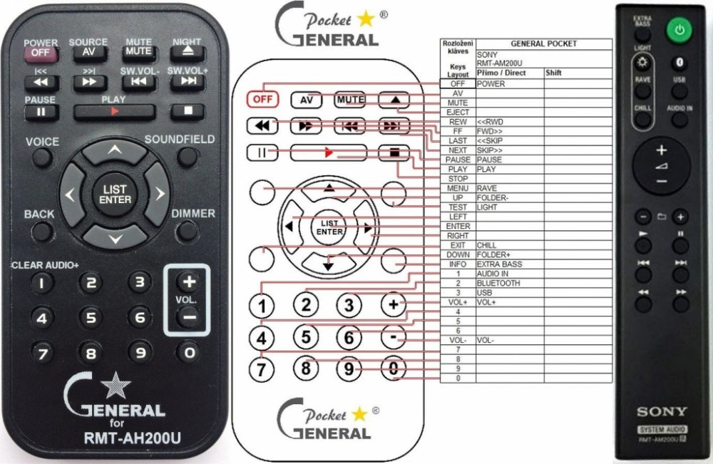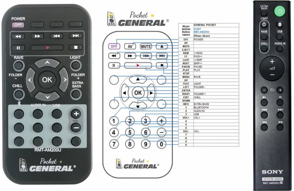 Dálkový ovladač SONY RMT-AM200U (RMTAM200U) duplikát 1:1 originálního dálkového ovladače. Dálkový ovladač byl vyvinut speciálně na míru pro tyto modely značky SONY:GTK-XB7, GTKXB7, GTX-XB60. (Nemusí zde být uvedeny úplně všechny kompatibilní modely. Pokud si nejste jisti, sdělte nám svůj model (použijte online chat, e-mail, telefon), neprodleně zkontrolujeme a ověříme, zda je tento ovladač kompatibilní s Vaším přístrojem. Za poskytnutou informaci ručíme.) Dálkový ovladač General POCKET duplikát má naprosto všechny funkce a popisky tlačítek stejné jako originální dálkový ovladač. Není třeba nic nastavovat, žádné kódy, funguje ihned po vložení baterií se všemi výše uvedenými modely.Ovladač je dodáván ve verzi značkového dálkového ovladače General POCKET duplikát (zobrazen vlevo) Jedná se o ovladač vyrobený pro specifické zařízení – NENÍ to univerzální ovladač! Má naprosto všechny funkce jako originální dálkový ovladač. Má stejné popisky tlačítek, jako jste byli zvyklí z originálu. Popisky tlačítek jsou velmi odolné a nejdou seškrábat ani hrubou silou. 3 roky záruka.General POCKET duplikát byl navržen a vyroben přesně podle originálního dálkového ovladače tlačítko po tlačítku. Ovladač je vyvinut a testován v České republice a podléhá CE a ROHS standardům. SNADNÉ INTUITIVNÍ POUŽÍVÁNÍ: Na rozdíl od běžných náhradních ovladačů, General POCKET duplikát má 100% odpovídající popisky tlačítek jako na originálním ovladači. Srovnání: Jiné univerzální nebo programovatelné náhrady mají kvůli snížení nákladů názvy/popisky a rozložení tlačítek univerzální, popisky tlačítek často neodpovídají funkci tlačítka a vyžadují tedy návody k použití. To často vede k nejasnostem, co které tlačítko dělá a stálá potřeba manuálu je velmi obtěžující. S ovladačem General POCKET duplikát žádný návod nepotřebujete, tlačítko dělá přesně to, co symbolizuje jeho popisek.GARANTUJEME 100% FUNKČNOST: Narozdíl od jiných náhrad je každý dálkový ovladač General POCKET duplikát přímo v naší firmě navržen a testová..