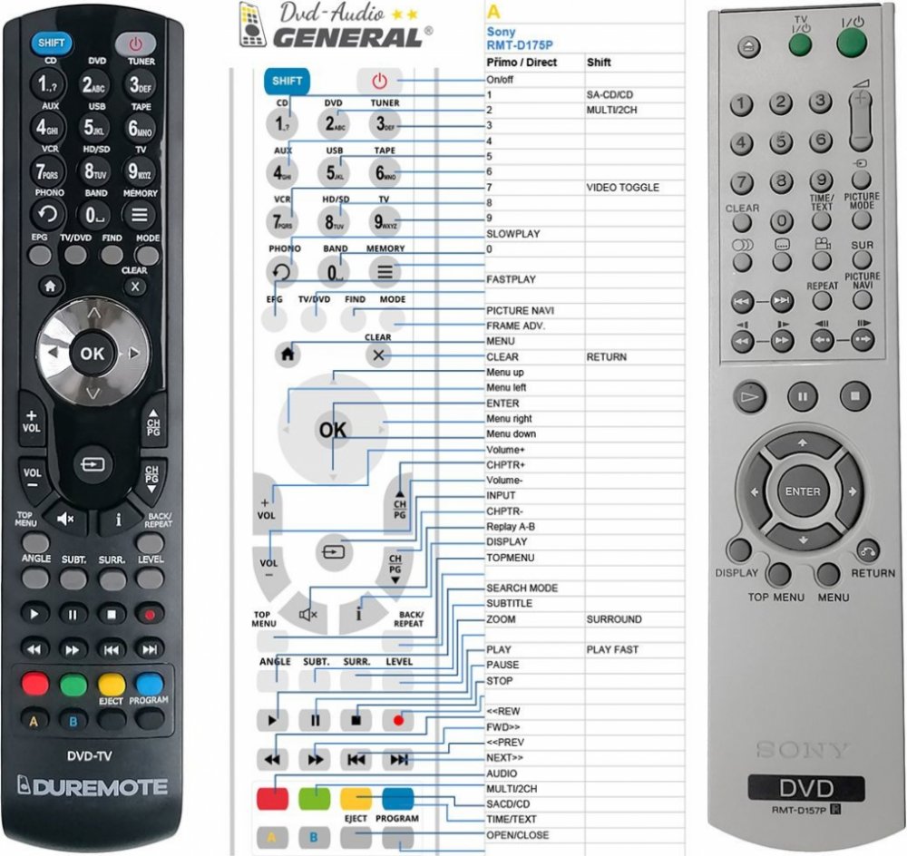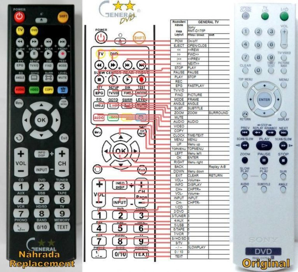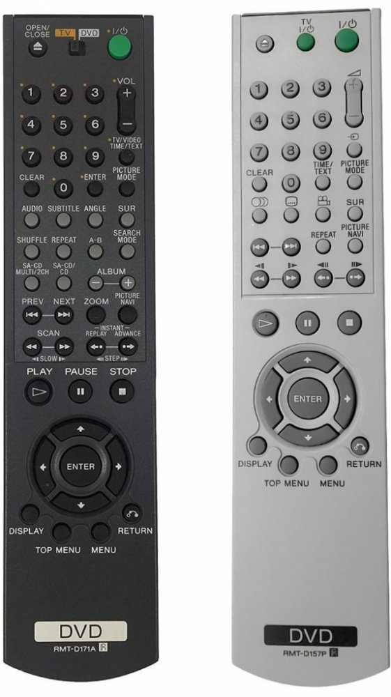 Náhradní dálkový ovladač SONY RMT-D157P (RMTD157P). Dálkový ovladač je určen pro tyto modely SONY:330, DVP-NS, DVP-NS 330, DVP-NS30, DVP-NS305, DVP-NS310, DVP-NS32, DVP-NS330, DVP-NS355, DVP-NS36, DVP-NS37, DVP-NS38, DVP-NS41, DVP-NS41P, DVP-NS430, DVP-NS50P, DVP-NS52P, DVP-NS585P, DVP-NS64P, DVP-NS67P, DVP-NS708H, DVP-NS730P, DVP-NS78H, DVP-NS9100ES, DVP-NS955, DVP-NS999ES. (Nemusí zde být uvedeny úplně všechny kompatibilní modely. Pokud si nejste jisti, sdělte nám svůj model (použijte online chat, e-mail, telefon), neprodleně zkontrolujeme a ověříme, zda je tento ovladač kompatibilní s Vaším přístrojem. Za poskytnutou informaci ručíme.) Byl nahrazen kompatibilním dálkovým ovladačem RMT-D171A (zobrazen vlevo).Vysoká kvalita materiálu a zpracování, naprosto bezporuchový. Všechny naše dálkové ovladače kontrolujeme a testujeme, proto garantujeme jejich spolehlivost, nadstandartně dlouhý dosah signálu a výbornou citlivost tlačítek.Tento dálkový ovladač nemusíte nijak párovat, nevyžaduje žádné nastavování ani kódy. Stačí vložit baterie a funguje se všemi výše uvedenými modely.
