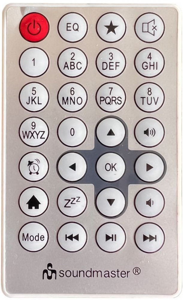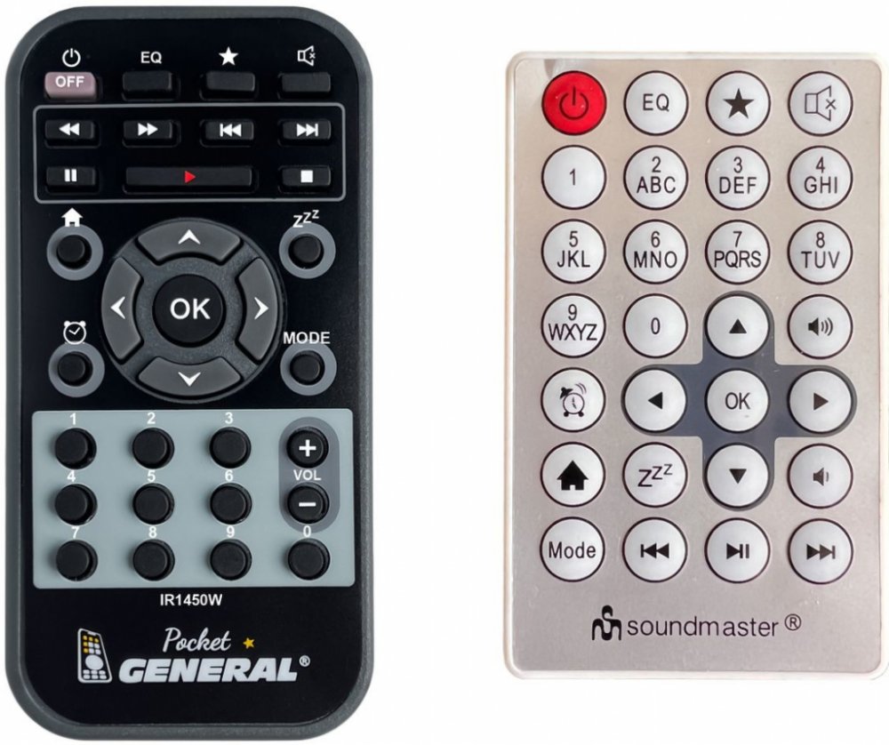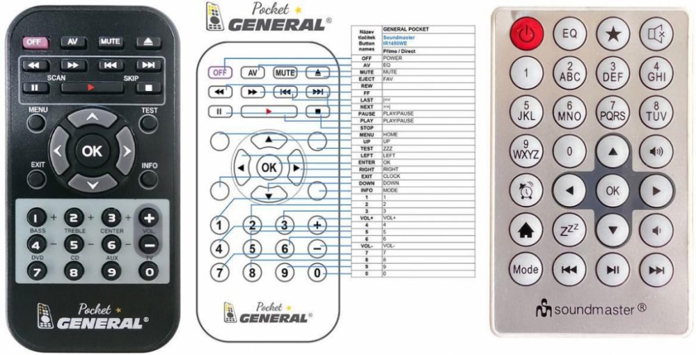 Náhradní dálkový ovladač Soundmaster IR1450W - 100% náhrada 1:1 za originální dálkový ovladač. Dálkový ovladač je určen pro tyto modely Soundmaster:IR1450W. (Nemusí zde být uvedeny úplně všechny kompatibilní modely. Pokud si nejste jisti, sdělte nám svůj model (použijte online chat, e-mail, telefon), neprodleně zkontrolujeme a ověříme, zda je tento ovladač kompatibilní s Vaším přístrojem. Za poskytnutou informaci ručíme.) Ovladač je dodáván ve verzi značkového dálkového ovladače General POCKET (zobrazen vlevo). Garantujeme Vám, že dostanete ovladač, který plně nahradí Váš původní originální ovladač a bude mít naprosto všechny funkce.Není to univerzální ovladač, ale ovladač, který je naprogramován a přímo určen pro modely přístrojů uvedené výše. Není třeba žádné párování, žádné kódy. Obdržíte od nás ovladač, který je připraven k použití - jediné, co musíte udělat, je vložit baterie a ovladač hned funguje. Podívejte se na obrázek ovladače a ujistěte se, že jsou v tabulce všechny funkce jako na původním originálním ovladači. Jedná se o plnohodnotný náhradní dálkový ovladač (není to „univerzál“). Má naprosto všechny funkce přesně jako originální ovladač. Záruční lhůta na ovladač je 2 roky. Dodáván také jednoduchý návod s mapováním funkcí.