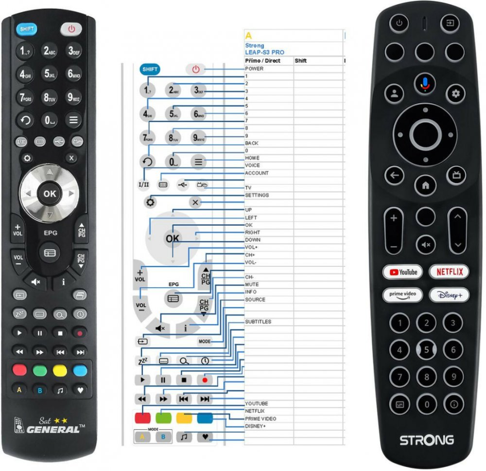 Náhradní dálkový ovladač STRONG LEAP-S3 PRO (LEAPS3 PRO) - 100% náhrada 1:1 za originální dálkový ovladač. Ovladač je dodáván ve verzi značkového dálkového ovladače General SAT/TV (zobrazen vlevo). Garantujeme Vám, že dostanete ovladač, který plně nahradí Váš původní originální ovladač a bude mít naprosto všechny funkce stejné.Není to univerzální ovladač, ale ovladač, který je naprogramován a přím
