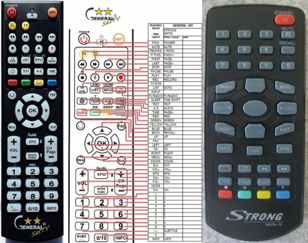Náhradní dálkový ovladač STRONG SRT55 - 100procent náhrada 1:1 za originální dálkový ovladač. Dálkový ovladač je určen pro tyto modely STRONG: SRT-55, SRT55. (Nemusí zde být uvedeny úplně všechny kompatibilní modely. Pokud si nejste jisti, sdělte nám svůj model (použijte online chat, e-mail, telefon), neprodleně zkontrolujeme a ověříme, zda je tento ovladač kompatibilní s Vaším přístrojem. Za poskytnutou informaci ručíme.) Ovladač je dodáván ve verzi značkového dálkového ovladače General SAT/TV (zobrazen vlevo). Garantujeme Vám, že dostanete ovladač, který plně nahradí Váš původní originální ovladač a bude mít naprosto všechny funkce. Není to univerzální ovladač, ale ovladač, který je naprogramován a přímo určen pro modely přístrojů uvedené výše. Není třeba žádné párování, žádné kódy. Obdržíte od nás ovladač, který je připraven k použití - jediné, co musíte udělat, je vložit baterie a ovladač hned funguje. Podívejte se na obrázek ovladače a ujistěte se, že jsou v tabulce všechny funkce jako na původním originálním ovladači. Jedná se o plnohodnotný náhradní dálkový ovladač (není to „univerzál“). Má naprosto všechny funkce přesně jako originální ovladač. Záruční lhůta na ovladač je 2 roky. Dodáván také jednoduchý návod s mapováním funkcí. DOPLŇKOVÁ FUNKCE: Tento dálkový ovladač je možno naprogramovat na 1 další přístroj. Budete moci jedním ovladačem ovládat oba přístroje (např. SAT plus TV nebo SAT plus DVD apod). Pokud nám do komentáře v objednávce napíšete model dalšího přístroje, naprogramujeme Vám ovladač na oba. Za tuto doplňkovou službu bude naúčtován příplatek k ceně ovladače 50 Kč: více informací
