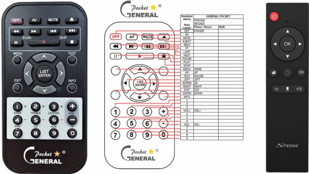 Náhradní dálkový ovladač STRONG SRT2023 - 100% náhrada 1:1 za originální dálkový ovladač. Dálkový ovladač byl vyvinut speciálně na míru pro tyto modely značky STRONG:SRT-2023, SRT2023. (Nemusí zde být uvedeny úplně všechny kompatibilní modely. Pokud si nejste jisti, sdělte nám svůj model (použijte online chat, e-mail, telefon), neprodleně zkontrolujeme a ověříme, zda je tento ovladač kompatibilní s Vaším přístrojem. Za poskytnutou informaci ručíme.) Ovladač je dodáván ve verzi značkového dálkového ovladače General POCKET (zobrazen vlevo). Garantujeme Vám, že dostanete ovladač, který plně nahradí Váš původní originální ovladač a bude mít naprosto všechny funkce stejné.Není to univerzální ovladač, ale ovladač, který je naprogramován a přímo určen pro modely přístrojů uvedené výše. Není třeba žádné párování, žádné kódy. Obdržíte od nás ovladač, který je připraven k použití - jediné, co musíte udělat, je vložit baterie a ovladač hned funguje. Podívejte se na obrázek ovladače a ujistěte se, že jsou v tabulce všechny funkce jako na původním originálním ovladači. Jedná se o plnohodnotný náhradní dálkový ovladač (není to „univerzál“). Má naprosto všechny funkce přesně jako originální ovladač. Záruční lhůta na ovladač je 3 roky. Dodáván také jednoduchý návod s mapováním funkcí.