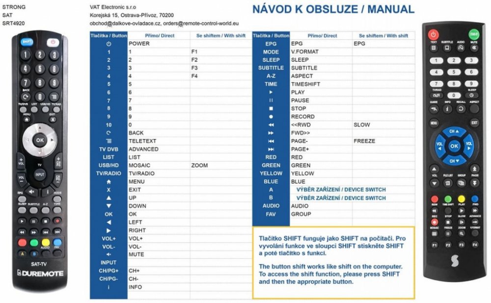 Náhradní dálkový ovladač STRONG SRT4920, SRT4922, SRT4922A, SRT5459 - 100% náhrada 1:1 za originální dálkový ovladač. Dokonalá 1:1 kopie navržená a vyrobená naší firmou – má všechny funkce originálního ovladače pro tyto modely značky STRONG:SRT4920, SRT4922, SRT4922A, SRT4950, SRT4950H, SRT5459. (Nemusí zde být uvedeny úplně všechny kompatibilní modely. Pokud si nejste jisti, sdělte nám svůj model (použijte online chat, e-mail, telefon), neprodleně zkontrolujeme a ověříme, zda je tento ovladač kompatibilní s Vaším přístrojem. Za poskytnutou informaci ručíme.) Ovladač je dodáván ve verzi značkového dálkového ovladače General Duremote (zobrazen vlevo). Garantujeme Vám, že dostanete ovladač, který plně nahradí Váš původní originální ovladač a bude mít naprosto všechny funkce stejné.Není to univerzální ovladač, ale ovladač, který je naprogramován a přímo určen pro modely přístrojů uvedené výše. Není třeba žádné párování, žádné kódy. Obdržíte od nás ovladač, který je připraven k použití - jediné, co musíte udělat, je vložit baterie a ovladač hned funguje. Podívejte se na obrázek ovladače a ujistěte se, že jsou v tabulce všechny funkce jako na původním originálním ovladači. Jedná se o plnohodnotný náhradní dálkový ovladač (není to „univerzál“). Má naprosto všechny funkce přesně jako originální ovladač. Záruční lhůta na ovladač je 3 roky. Dodáván také jednoduchý návod s mapováním funkcí. DOPLŇKOVÁ FUNKCE: Tento dálkový ovladač je možno naprogramovat na 1 další přístroj. Budete moci jedním ovladačem ovládat oba přístroje. Pokud nám do komentáře v objednávce napíšete model dalšího přístroje, naprogramujeme Vám ovladač na oba. Za tuto doplňkovou službu bude naúčtován příplatek k ceně ovladače 50 Kč: více informací