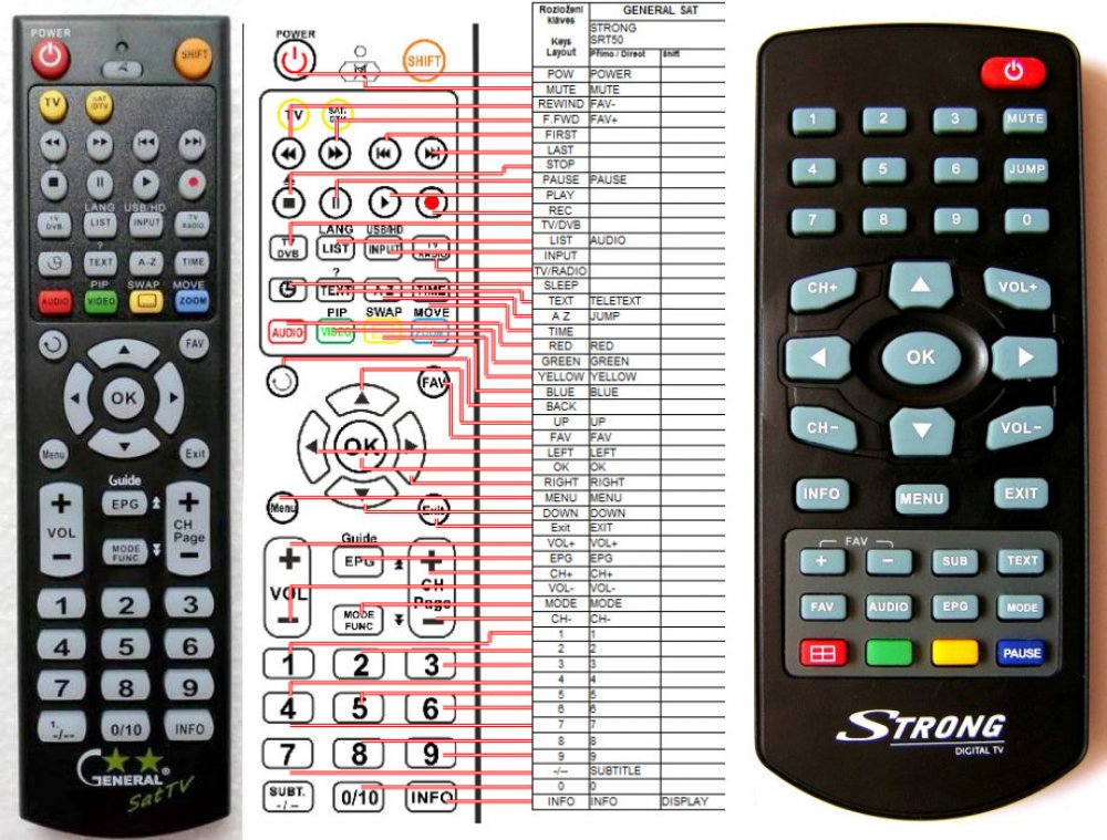 Náhradní dálkový ovladač STRONG SRT50, SRT51 - 100% náhrada 1:1 za originální dálkový ovladač. Dálkový ovladač byl vyvinut speciálně na míru pro tyto modely značky STRONG:SRT50, SRT51. (Nemusí zde být uvedeny úplně všechny kompatibilní modely. Pokud si nejste jisti, sdělte nám svůj model (použijte online chat, e-mail, telefon), neprodleně zkontrolujeme a ověříme, zda je tento ovladač kompatibilní s Vaším přístrojem. Za poskytnutou informaci ručíme.) Ovladač je dodáván ve verzi značkového dálkového ovladače General SAT/TV (zobrazen vlevo). Garantujeme Vám, že dostanete ovladač, který plně nahradí Váš původní originální ovladač a bude mít naprosto všechny funkce stejné.Není to univerzální ovladač, ale ovladač, který je naprogramován a přímo určen pro modely přístrojů uvedené výše. Není třeba žádné párování, žádné kódy. Obdržíte od nás ovladač, který je připraven k použití - jediné, co musíte udělat, je vložit baterie a ovladač hned funguje. Podívejte se na obrázek ovladače a ujistěte se, že jsou v tabulce všechny funkce jako na původním originálním ovladači. Jedná se o plnohodnotný náhradní dálkový ovladač (není to „univerzál“). Má naprosto všechny funkce přesně jako originální ovladač. Záruční lhůta na ovladač je 3 roky. Dodáván také jednoduchý návod s mapováním funkcí. DOPLŇKOVÁ FUNKCE: Tento dálkový ovladač je možno naprogramovat na 1 další přístroj. Budete moci jedním ovladačem ovládat oba přístroje (např. SAT+TV nebo SAT+DVD apod). Pokud nám do komentáře v objednávce napíšete model dalšího přístroje, naprogramujeme Vám ovladač na oba. Za tuto doplňkovou službu bude naúčtován příplatek k ceně ovladače 50 Kč: více informací