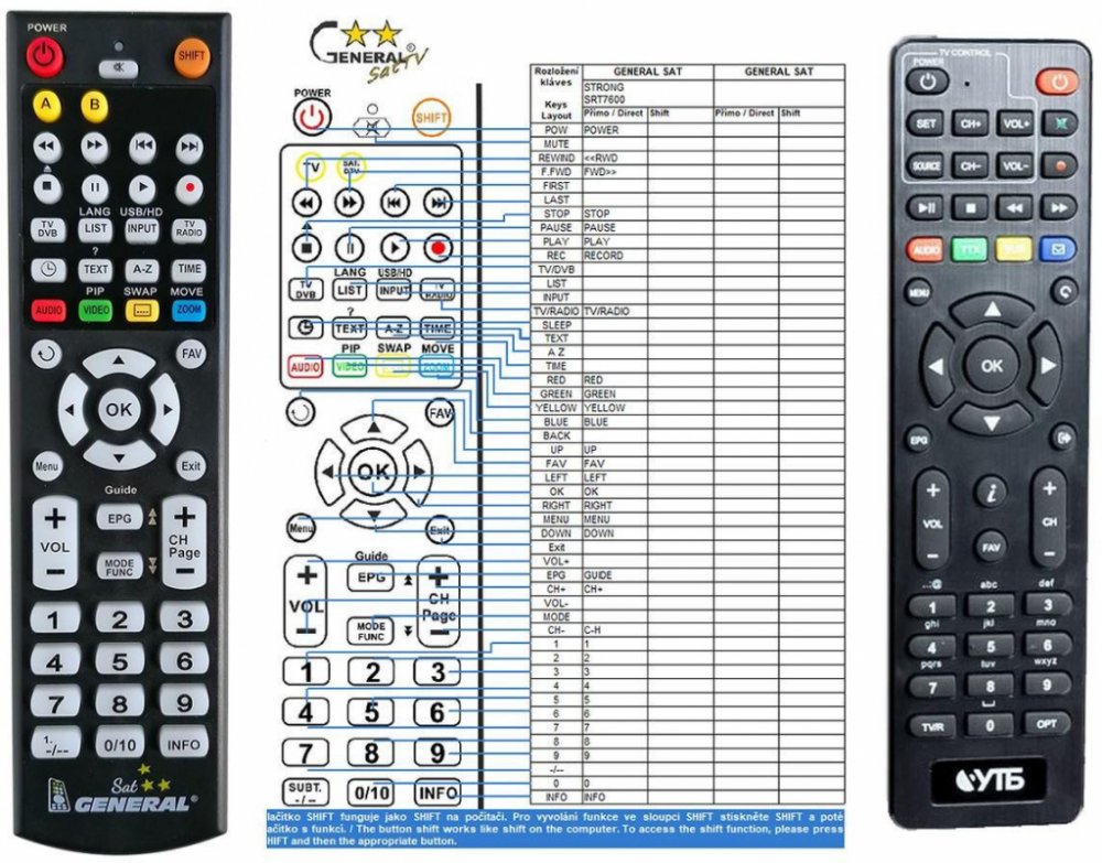 Náhradní dálkový ovladač STRONG SRT7600 - 100% náhrada 1:1 za originální dálkový ovladač. Dálkový ovladač byl vyvinut speciálně na míru pro tyto modely značky STRONG:SRT-7600, SRT7600. (Nemusí zde být uvedeny úplně všechny kompatibilní modely. Pokud si nejste jisti, sdělte nám svůj model (použijte online chat, e-mail, telefon), neprodleně zkontrolujeme a ověříme, zda je tento ovladač kompatibilní s Vaším přístrojem. Za poskytnutou informaci ručíme.) Ovladač je dodáván ve verzi značkového dálkového ovladače General SAT/TV (zobrazen vlevo). Garantujeme Vám, že dostanete ovladač, který plně nahradí Váš původní originální ovladač a bude mít naprosto všechny funkce stejné.Není to univerzální ovladač, ale ovladač, který je naprogramován a přímo určen pro modely přístrojů uvedené výše. Není třeba žádné párování, žádné kódy. Obdržíte od nás ovladač, který je připraven k použití - jediné, co musíte udělat, je vložit baterie a ovladač hned funguje. Podívejte se na obrázek ovladače a ujistěte se, že jsou v tabulce všechny funkce jako na původním originálním ovladači. Jedná se o plnohodnotný náhradní dálkový ovladač (není to „univerzál“). Má naprosto všechny funkce přesně jako originální ovladač. Záruční lhůta na ovladač je 3 roky. Dodáván také jednoduchý návod s mapováním funkcí. DOPLŇKOVÁ FUNKCE: Tento dálkový ovladač je možno naprogramovat na 1 další přístroj. Budete moci jedním ovladačem ovládat oba přístroje (např. SAT+TV nebo SAT+DVD apod). Pokud nám do komentáře v objednávce napíšete model dalšího přístroje, naprogramujeme Vám ovladač na oba. Za tuto doplňkovou službu bude naúčtován příplatek k ceně ovladače 50 Kč: více informací