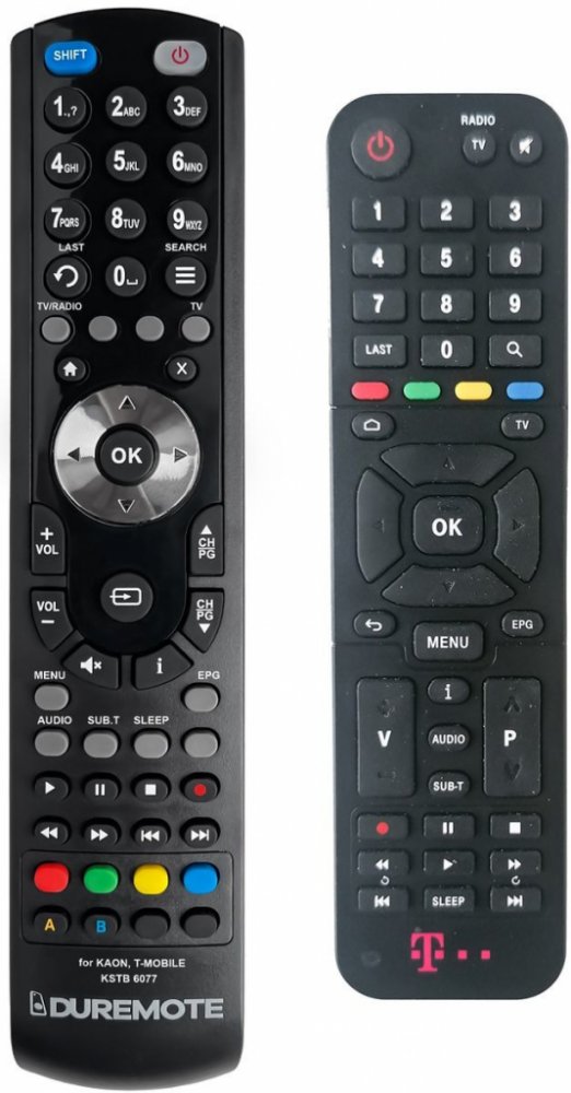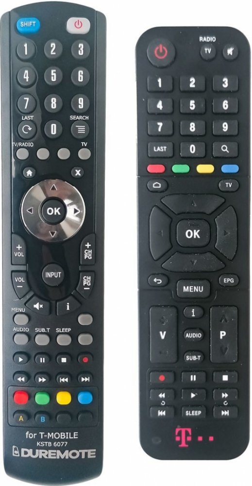 Dálkový ovladač T-MOBILE KSTB6077 duplikát 1:1 originálního dálkového ovladače. Dokonalá 1:1 kopie navržená a vyrobená naší firmou – má všechny funkce originálního ovladače pro tyto modely značky T-MOBILE:KSTB6077, KSTB6078. (Nemusí zde být uvedeny úplně všechny kompatibilní modely. Pokud si nejste jisti, sdělte nám svůj model (použijte online chat, e-mail, telefon), neprodleně zkontrolujeme a ověříme, zda je tento ovladač kompatibilní s Vaším přístrojem. Za poskytnutou informaci ručíme.) Dálkový ovladač General Duremote má naprosto všechny funkce a popisky tlačítek stejné jako originální dálkový ovladač. Není třeba nic nastavovat, žádné kódy, funguje ihned po vložení baterií se všemi výše uvedenými modely.Ovladač je dodáván ve verzi značkového dálkového ovladače General Duremote (zobrazen vlevo)Jedná se o ovladač vyrobený pro specifické zařízení – NENÍ to univerzální ovladač!Má naprosto všechny funkce jako originální dálkový ovladač.Má stejné popisky tlačítek, jako jste byli zvyklí z originálu.Popisky tlačítek jsou velmi odolné a nejdou seškrábat ani hrubou silou.3 roky záruka.Nulová poruchovost tohoto modelu! Nemáme zádné reklamace a přitom je to náš nejprodávanější ovladač.General Duremote byl tlačítko po tlačítku navržen a vyroben přesně podle originálního dálkového ovladače na obrázku vpravo. Výroben v naší firmě v Ostravě, vývoj, výroba i atesty v České republice - splňuje CE a ROHS standardy.SNADNÉ INTUITIVNÍ POUŽÍVÁNÍ: Na rozdíl od běžných náhradních ovladačů, General Duremote má 100% stejné popisky tlačítek jako Váš původní originální dálkový ovladač.Srovnání: Ostatní univerzální nebo programovatelné náhrady mají (kvůli úspoře nákladů) univerzální rozložení s nesprávně označenými tlačítky, a proto potřebují návod (tabulku funkcí), který říká, jaká je skutečná funkce jednotlivých tlačítek. To může způsobovat zmatek a nutnost neustálého vracení se k návodu je pro koncového uživatele obtěžující. Naopak při používání našeho dálkového ovladače General Duremote nahlížet do návodu v..