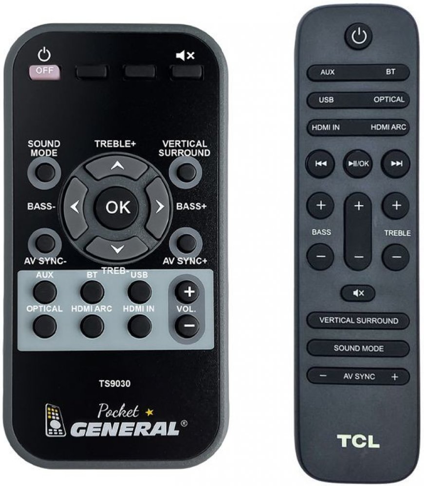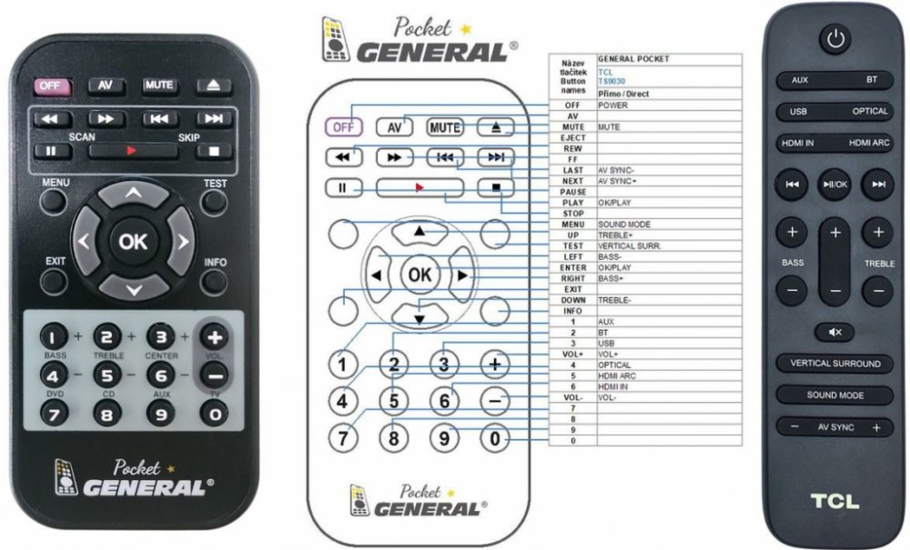 Náhradní dálkový ovladač TCL TS9030 - 100% náhrada 1:1 za originální dálkový ovladač. Dálkový ovladač byl vyvinut speciálně na míru pro tyto modely značky TCL:TS-9030, TS9030. (Nemusí zde být uvedeny úplně všechny kompatibilní modely. Pokud si nejste jisti, sdělte nám svůj model (použijte online chat, e-mail, telefon), neprodleně zkontrolujeme a ověříme, zda je tento ovladač kompatibilní s Vaším přístrojem. Za poskytnutou informaci ručíme.) Ovladač je dodáván ve verzi značkového dálkového ovladače General POCKET (zobrazen vlevo). Garantujeme Vám, že dostanete ovladač, který plně nahradí Váš původní originální ovladač a bude mít naprosto všechny funkce stejné.Není to univerzální ovladač, ale ovladač, který je naprogramován a přímo určen pro modely přístrojů uvedené výše. Není třeba žádné párování, žádné kódy. Obdržíte od nás ovladač, který je připraven k použití - jediné, co musíte udělat, je vložit baterie a ovladač hned funguje. Podívejte se na obrázek ovladače a ujistěte se, že jsou v tabulce všechny funkce jako na původním originálním ovladači. Jedná se o plnohodnotný náhradní dálkový ovladač (není to „univerzál“). Má naprosto všechny funkce přesně jako originální ovladač. Záruční lhůta na ovladač je 3 roky. Dodáván také jednoduchý návod s mapováním funkcí.