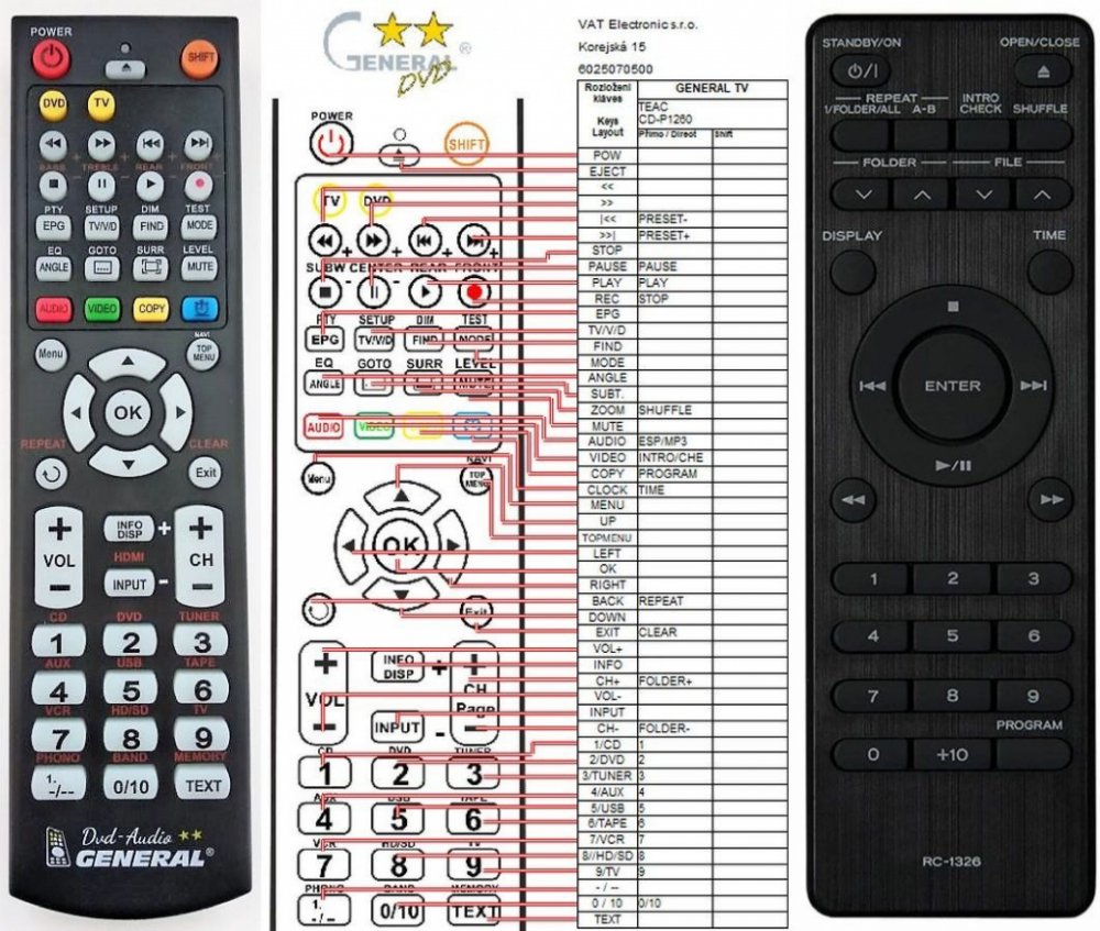 Náhradní dálkový ovladač TEAC RC-1326 (RC1326) - 100procent náhrada 1:1 za originální dálkový ovladač. Dálkový ovladač je určen pro tyto modely TEAC: CD-P1260MK II, CD-P1260MK-II, CDP1260MKII. (Nemusí zde být uvedeny úplně všechny kompatibilní modely. Pokud si nejste jisti, sdělte nám svůj model (použijte online chat, e-mail, telefon), neprodleně zkontrolujeme a ověříme, zda je tento ovladač kompatibilní s Vaším přístrojem. Za poskytnutou informaci ručíme.) Ovladač je dodáván ve verzi značkového dálkového ovladače General DVD/AUDIO (zobrazen vlevo). Garantujeme Vám, že dostanete ovladač, který plně nahradí Váš původní originální ovladač a bude mít naprosto všechny funkce. Není to univerzální ovladač, ale ovladač, který je naprogramován a přímo určen pro modely přístrojů uvedené výše. Není třeba žádné párování, žádné kódy. Obdržíte od nás ovladač, který je připraven k použití - jediné, co musíte udělat, je vložit baterie a ovladač hned funguje. Podívejte se na obrázek ovladače a ujistěte se, že jsou v tabulce všechny funkce jako na původním originálním ovladači. Jedná se o plnohodnotný náhradní dálkový ovladač (není to „univerzál“). Má naprosto všechny funkce přesně jako originální ovladač. Záruční lhůta na ovladač je 2 roky. Dodáván také jednoduchý návod s mapováním funkcí. DOPLŇKOVÁ FUNKCE: Tento dálkový ovladač je možno naprogramovat na 1 další přístroj. Budete moci jedním ovladačem ovládat oba přístroje (např. DVD plus TV nebo SOUNDBAR plus TV apod.). Pokud nám do komentáře v objednávce napíšete model dalšího přístroje, naprogramujeme Vám ovladač na oba. Za tuto doplňkovou službu bude naúčtován příplatek k ceně ovladače 50 Kč: více informací