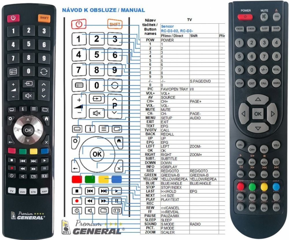 Náhradní dálkový ovladač TECHNIKA RC-D3-02 (RCD302) - 100% náhrada 1:1 za originální dálkový ovladač. Dálkový ovladač byl vyvinut speciálně na míru pro tyto modely značky TECHNIKA:15-600, 15.1-600, 15.6-600, 15.6-601, 19-600, 21.6-600, 24 FULL HD DVD COMBI WITH DVBT, LCD 22.6-600, LCD-19-600, LCD15-601, LCD15-643, LCD19-601. (Nemusí zde být uvedeny úplně všechny kompatibilní modely. Pokud si nejste jisti, sdělte nám svůj model (použijte online chat, e-mail, telefon), neprodleně zkontrolujeme a ověříme, zda je tento ovladač kompatibilní s Vaším přístrojem. Za poskytnutou informaci ručíme.) Ovladač je dodáván ve verzi značkového dálkového ovladače General Premium (zobrazen vlevo). Garantujeme Vám, že dostanete ovladač, který plně nahradí Váš původní originální ovladač a bude mít naprosto všechny funkce stejné.Není to univerzální ovladač, ale ovladač, který je naprogramován a přímo určen pro modely přístrojů uvedené výše. Není třeba žádné párování, žádné kódy. Obdržíte od nás ovladač, který je připraven k použití - jediné, co musíte udělat, je vložit baterie a ovladač hned funguje. Podívejte se na obrázek ovladače a ujistěte se, že jsou v tabulce všechny funkce jako na původním originálním ovladači. Jedná se o plnohodnotný náhradní dálkový ovladač (není to „univerzál“). Má naprosto všechny funkce přesně jako originální ovladač. Záruční lhůta na ovladač je 3 roky. Dodáván také jednoduchý návod s mapováním funkcí. DOPLŇKOVÁ FUNKCE: Tento dálkový ovladač je možno naprogramovat na 1-4 zařízení (celkem tedy 4). Budete moci jedním ovladačem ovládat několik různých přístrojů jedním ovladačem. Pokud nám do komentáře v objednávce napíšete modely dalších přístrojů, naprogramujeme Vám ovladač na všechny. Za tuto doplňkovou službu bude naúčtován příplatek k ceně ovladače 50 Kč: více informacíV případě, že v budoucnu vyměníte/obměníte Vaši domácí elektroniku, jsme schopni Vám tento ovladač přeprogramovat na naprosto jakékoliv nové/á zařízení. Ovladač General přeži..