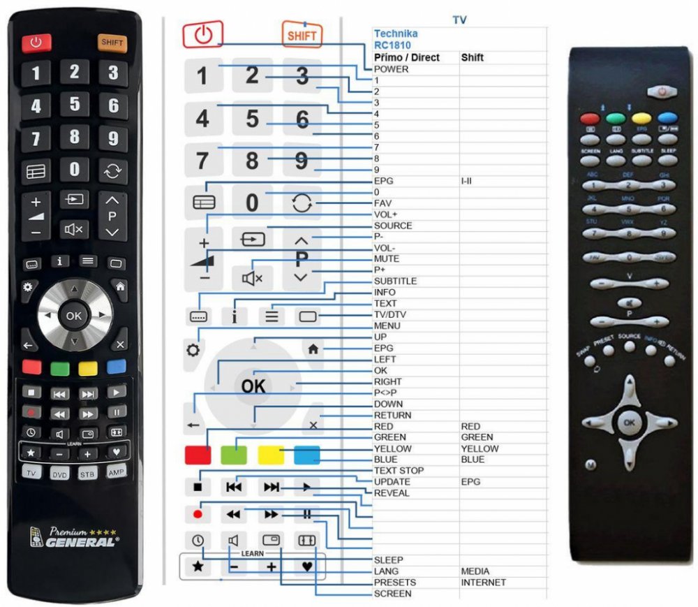 Náhradní dálkový ovladač TECHNIKA RC1810 - 100% náhrada 1:1 za originální dálkový ovladač. Dálkový ovladač je určen pro tyto modely TECHNIKA:LCD19-941, LCD19941. (Nemusí zde být uvedeny úplně všechny kompatibilní modely. Pokud si nejste jisti, sdělte nám svůj model (použijte online chat, e-mail, telefon), neprodleně zkontrolujeme a ověříme, zda je tento ovladač kompatibilní s Vaším přístrojem. Za poskytnutou informaci ručíme.) Ovladač je dodáván ve verzi značkového dálkového ovladače General Premium (zobrazen vlevo). Garantujeme Vám, že dostanete ovladač, který plně nahradí Váš původní originální ovladač a bude mít naprosto všechny funkce.Není to univerzální ovladač, ale ovladač, který je naprogramován a přímo určen pro modely přístrojů uvedené výše. Není třeba žádné párování, žádné kódy. Obdržíte od nás ovladač, který je připraven k použití - jediné, co musíte udělat, je vložit baterie a ovladač hned funguje. Podívejte se na obrázek ovladače a ujistěte se, že jsou v tabulce všechny funkce jako na původním originálním ovladači. Jedná se o plnohodnotný náhradní dálkový ovladač (není to „univerzál“). Má naprosto všechny funkce přesně jako originální ovladač. Záruční lhůta na ovladač je 2 roky. Dodáván také jednoduchý návod s mapováním funkcí. DOPLŇKOVÁ FUNKCE: Tento dálkový ovladač je možno naprogramovat na 1-4 zařízení (celkem tedy 4). Budete moci jedním ovladačem ovládat několik různých přístrojů jedním ovladačem. Pokud nám do komentáře v objednávce napíšete modely dalších přístrojů, naprogramujeme Vám ovladač na všechny. Za tuto doplňkovou službu bude naúčtován příplatek k ceně ovladače 50 Kč: více informacíV případě, že v budoucnu vyměníte/obměníte Vaši domácí elektroniku, jsme schopni Vám tento ovladač přeprogramovat na naprosto jakékoliv nové/á zařízení. Ovladač General přežije Váš stávající přístroj!