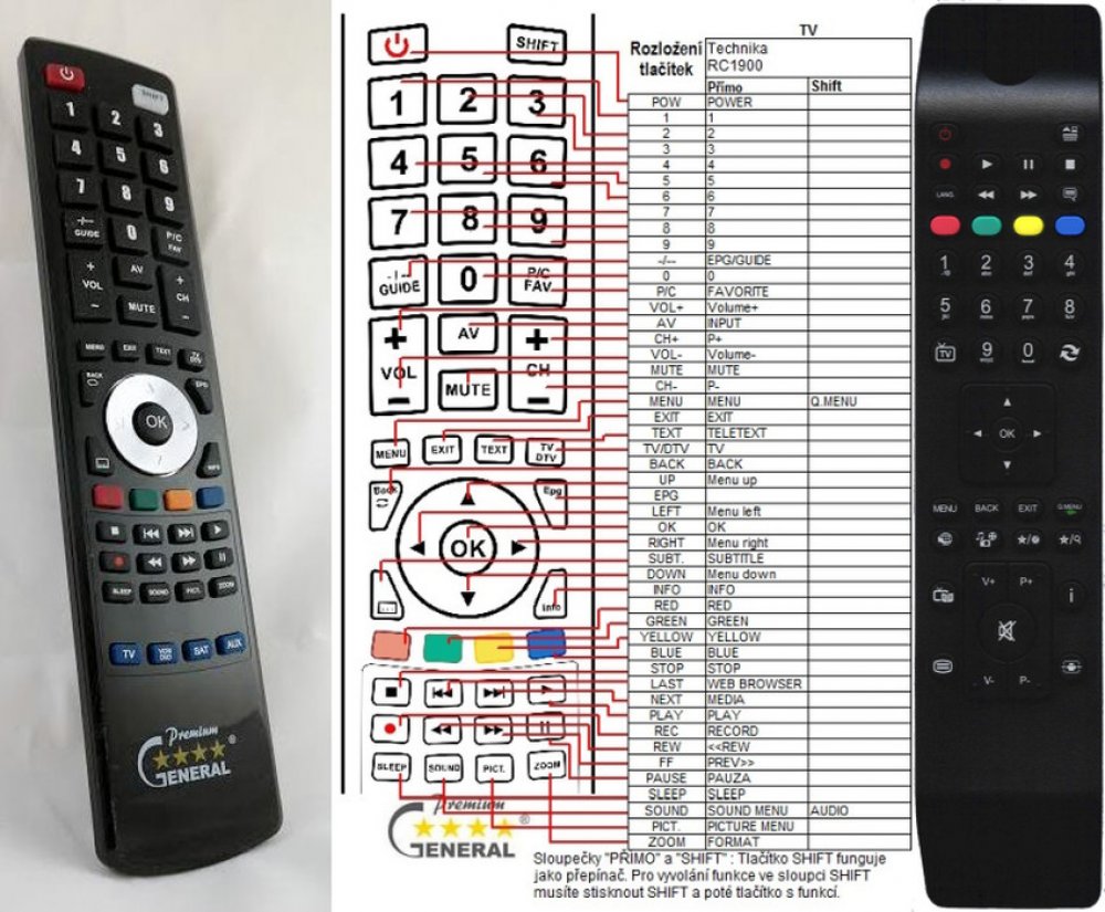 Náhradní dálkový ovladač TECHNIKA RC4800. Dálkový ovladač byl vyvinut speciálně na míru pro tyto modely značky TECHNIKA:19-200BL, 19-200G, 19-200W, 24LF904SS13, 32-904A DLED FHD 5S14, 32-904A DLED FHD SS14, 40-904A DLED FHD 5S14, 40-904A DLED FHD SS14, 40/804A DLED FHD SS14, 50-904A DLED FHD 5S14, 50-904A DLED FHD SS14, 904A DLED FHD SS14. (Nemusí zde být uvedeny úplně všechny kompatibilní modely. Pokud si nejste jisti, sdělte nám svůj model (použijte online chat, e-mail, telefon), neprodleně zkontrolujeme a ověříme, zda je tento ovladač kompatibilní s Vaším přístrojem. Za poskytnutou informaci ručíme.) Jedná se o naprosto stejný dálkový ovladač jako originál. Jediný rozdíl je, že nemá logo TECHNIKA (to je jediný důvod, proč je levnější). Vysoká kvalita materiálu a zpracování, naprosto bezporuchový. Všechny naše dálkové ovladače kontrolujeme a testujeme, proto garantujeme jejich spolehlivost, nadstandartně dlouhý dosah signálu a výbornou citlivost tlačítek.Tento dálkový ovladač nemusíte nijak párovat, nevyžaduje žádné nastavování ani kódy. Stačí vložit baterie a funguje se všemi výše uvedenými modely.