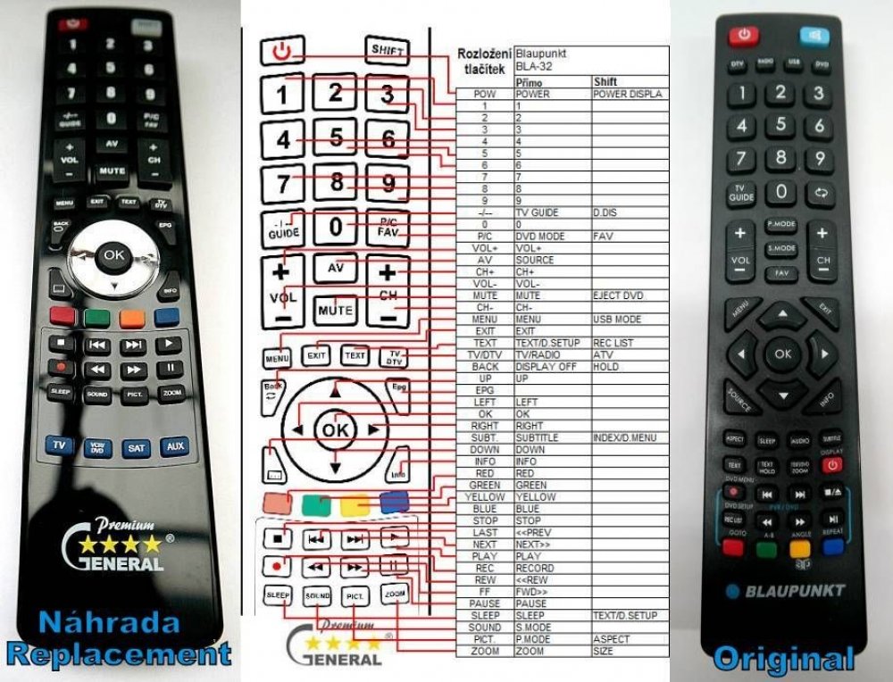 Náhradní dálkový ovladač TECHNIKA UNF/RMC/0002 - 100procent náhrada 1:1 za originální dálkový ovladač. Dálkový ovladač je určen pro tyto modely TECHNIKA: 215/189JGB2B, 22LF204D, 23/157I-GB-3B-HBCDUP, 23/157I-GB-3B-HBCUP, 23/157I-GB-3B-HBKDUP, 23/157I-GB-3B-HBKUP, 23/157I-GW-3W-HBCDUP, 23/157I-GW-3W-HBKDUP, 23/157J-GB-3B-HKDU, 23/157L-GB-3B-HBKDUP-EU, 26L-204D, 29L240SS13, 32-122 LED32L244, 32/122G, 32/122I, 32/122I-GB-38-HBKU-EU, 32/122J-GB-3B2-HCU-EU, 32L-224, 32L-244, 32L224, 32L244, 40-260, 40/122G, 40/260, 50/211F 50E21B-FHD, B23K157TCDP-B, BB 42I156B, BC23W157BBKDPE967, BW 23T189B, LED 32/122L/GB, LED 32L-244B, LED32-E251, LED32-E251 (32/122G, LED32L-244B, LED40-E271, LED40-E271 (40/122G), TA32L122BHCUE863., X23/50E-BG-FTCDU, X26/56J-GB-HCDUP-EU, XORO HTC2444. (Nemusí zde být uvedeny úplně všechny kompatibilní modely. Pokud si nejste jisti, sdělte nám svůj model (použijte online chat, e-mail, telefon), neprodleně zkontrolujeme a ověříme, zda je tento ovladač kompatibilní s Vaším přístrojem. Za poskytnutou informaci ručíme.) Také se používá pro značky: Blaupunkt Ovladač je dodáván ve verzi značkového dálkového ovladače General Premium (zobrazen vlevo). Garantujeme Vám, že dostanete ovladač, který plně nahradí Váš původní originální ovladač a bude mít naprosto všechny funkce. Není to univerzální ovladač, ale ovladač, který je naprogramován a přímo určen pro modely přístrojů uvedené výše. Není třeba žádné párování, žádné kódy. Obdržíte od nás ovladač, který je připraven k použití - jediné, co musíte udělat, je vložit baterie a ovladač hned funguje. Podívejte se na obrázek ovladače a ujistěte se, že jsou v tabulce všechny funkce jako na původním originálním ovladači. Jedná se o plnohodnotný náhradní dálkový ovladač (není to „univerzál“). Má naprosto všechny funkce přesně jako originální ovladač. Záruční lhůta na ovladač je 2 roky. Dodáván také jednoduchý návod s mapováním funkcí. DOPLŇKOVÁ FUNKCE: Tento dálkový ovladač je možno naprogramovat na 1-4 zařízení (celkem tedy 4). Budete moci jedním ovladačem ovládat několik různých přístrojů jedním ovladačem. Pokud nám do komentáře v objednávce napíšete modely dalších přístrojů, naprogramujeme Vám ovladač na všechny. Za tuto doplňkovou službu bude naúčtován příplatek k ceně ovladače 50 Kč: více informací V případě, že v budoucnu vyměníte/obměníte Vaši domácí elektroniku, jsme schopni Vám tento ovladač přeprogramovat na naprosto jakékoliv nové/á zařízení. Ovladač General přežije Váš stávající přístroj!