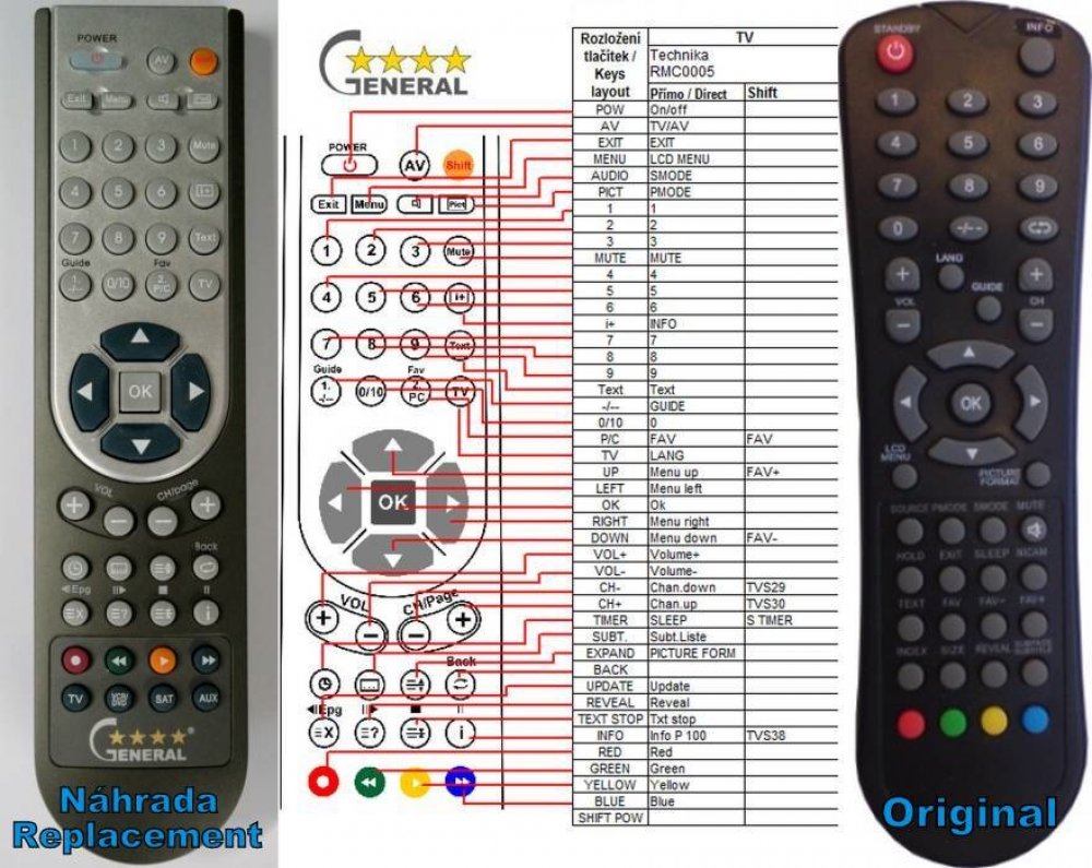 Náhradní dálkový ovladač TECHNIKA XMU/RMC/0005 - 100procent náhrada 1:1 za originální dálkový ovladač. Dálkový ovladač je určen pro tyto modely TECHNIKA: L216/17-GB-TC-UK, L216/22-GB-TC-UK, LCD 15-341, VI1500D, VI1900D, X156/17-GB-TC-UK, X19/17-GB-TC-UK, X216/17-GB-TC-UK, X26/16-GB-TC-UK. (Nemusí zde být uvedeny úplně všechny kompatibilní modely. Pokud si nejste jisti, sdělte nám svůj model (použijte online chat, e-mail, telefon), neprodleně zkontrolujeme a ověříme, zda je tento ovladač kompatibilní s Vaším přístrojem. Za poskytnutou informaci ručíme.) Ovladač je dodáván ve verzi značkového dálkového ovladače General Premium (zobrazen vlevo). Garantujeme Vám, že dostanete ovladač, který plně nahradí Váš původní originální ovladač a bude mít naprosto všechny funkce. Není to univerzální ovladač, ale ovladač, který je naprogramován a přímo určen pro modely přístrojů uvedené výše. Není třeba žádné párování, žádné kódy. Obdržíte od nás ovladač, který je připraven k použití - jediné, co musíte udělat, je vložit baterie a ovladač hned funguje. Podívejte se na obrázek ovladače a ujistěte se, že jsou v tabulce všechny funkce jako na původním originálním ovladači. Jedná se o plnohodnotný náhradní dálkový ovladač (není to „univerzál“). Má naprosto všechny funkce přesně jako originální ovladač. Záruční lhůta na ovladač je 2 roky. Dodáván také jednoduchý návod s mapováním funkcí. DOPLŇKOVÁ FUNKCE: Tento dálkový ovladač je možno naprogramovat na 1-4 zařízení (celkem tedy 4). Budete moci jedním ovladačem ovládat několik různých přístrojů jedním ovladačem. Pokud nám do komentáře v objednávce napíšete modely dalších přístrojů, naprogramujeme Vám ovladač na všechny. Za tuto doplňkovou službu bude naúčtován příplatek k ceně ovladače 50 Kč: více informací V případě, že v budoucnu vyměníte/obměníte Vaši domácí elektroniku, jsme schopni Vám tento ovladač přeprogramovat na naprosto jakékoliv nové/á zařízení. Ovladač General přežije Váš stávající přístroj!