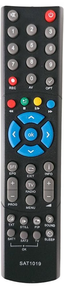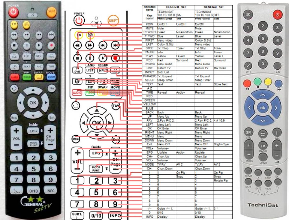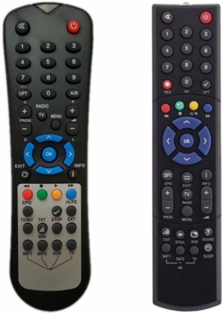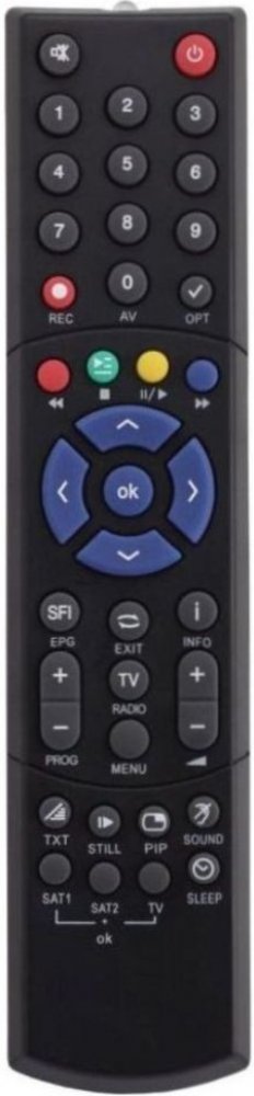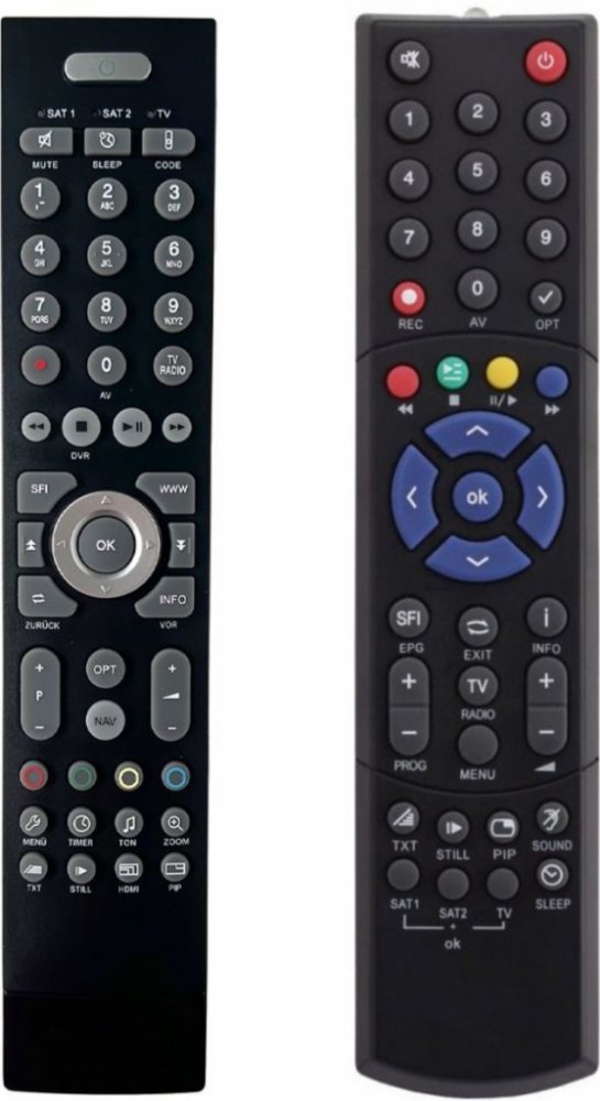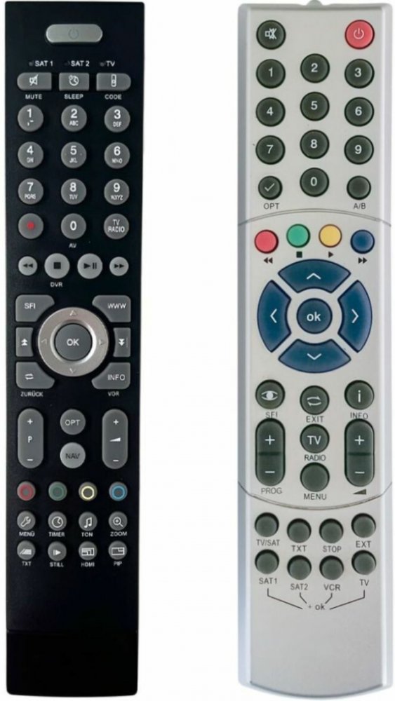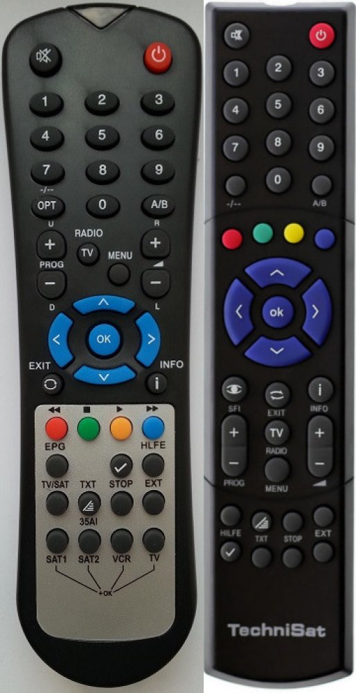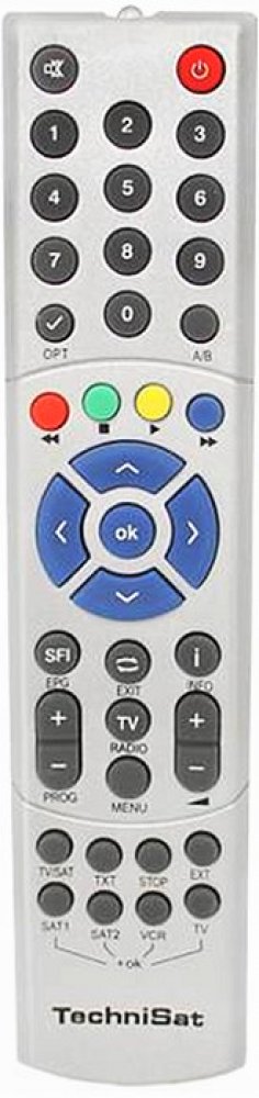 Replika originálního dálkového ovladače (zobrazená vlevo!) TechniSat MF4-S (MF4-S CC), Digit MF4-K, TECHNISAT DIGIPLUS STR 1, Digipal 2, Digipal 2 TX. Pomocí tlačítek SAT1/SAT2 je možné ovládat dva přístroje TechniSat současně např. Digicorder plus Digipal 2. Přístroje se neruší.